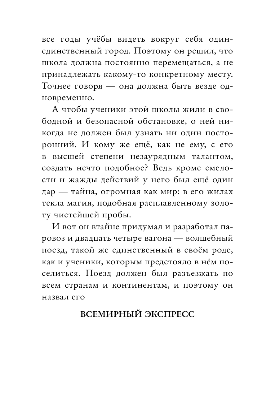 Это история произошла одной звёздной ночью, когда тринадцатилетняя Флинн сидела на перроне заброшенной железнодорожной станции. Именно здесь два года назад пропал её любимый брат Йонте. За всё это время от него пришла одна-единственная открытка с изображением старинного поезда со странным названием "Всемирный экспресс". Так каково же было изумление Флинн, когда этот поезд прибыл на ночной перрон. Без лишних раздумий, девочка запрыгнула в него и… очутилась в самой необычной школе на свете! И хотя Йонте больше нет в поезде, Флинн предстоит совершить удивительное путешествие, открыть мир магии, найти друзей и врагов, а главное – узнать мрачную тайну, которую хранит Всемирный экспресс. Не упусти уникальный шанс попасть на борт "Всемирного экспресса" и совершить самое захватывающее путешествие в твоей жизни! Магический поезд отправляется… Первая книга серии.