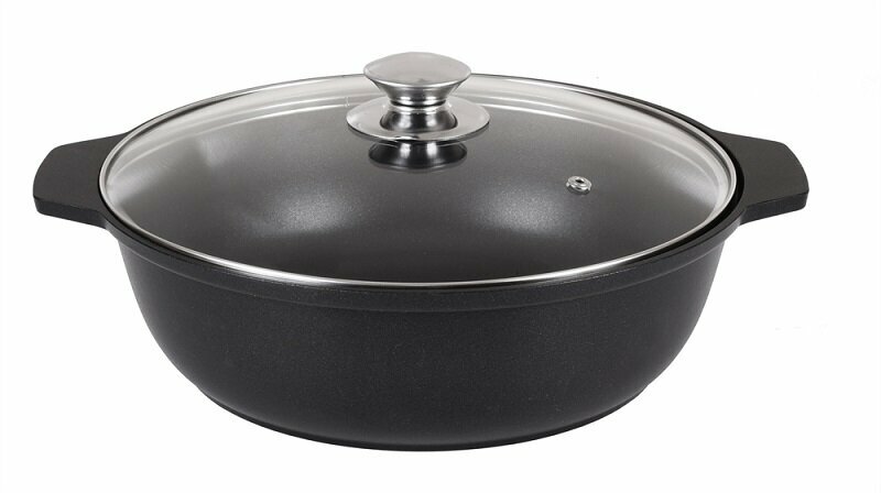 Продукция Kukmara изготовлена из литого алюминия и покрыта немецким высококачественным антипригарным покрытием на водной основе, усиленным сверхпрочными минеральными частицами. Преимущества посуды KukmaraЗначительная толщина стенок и дна исключает деформацию корпуса посуды, гарантирует её долговечность, обеспечивает необходимую прочность покрытия. Высокопрочное антипригарное покрытие на водной основе, усиленное сверхпрочными минеральными частицами. Экологически безопасное антипригарное покрытие без содержания PFOA (перфторированная карбоновая кислота). Идеальное распределение тепла по всей поверхности посуды, длительное сохранение тепла. Возможность использования минимального количества жира. Антипригарное покрытие наносится методом напыления, который гарантирует исключительную стойкость покрытия при эксплуатации. Мелкие царапины и небольшие потёртости на поверхности посуды не влияют на свойства антипригарного покрытия и долговечность посуды. Продукты не пригорают и сохраняют свой вкус. Утолщённое дно до 6 мм. Высокая теплопроводность и эргономичность. Лёгкость мытья. Подходит для всех типов плит, кроме индукционных. Можно мыть в посудомоечной машине. Стенки посуды TM Kukmara состоят из 5 слоёвВысокопрочное антипригарное покрытие на водной основе, усиленное сверхпрочными минеральными частицами. Усиленный грунтовой слой. Слой с шероховатой поверхностью для лучшего сцепления покрытия. Литой алюминиевый корпус толщиной до 6 мм. Наружный слой — высокопрочное антипригарное покрытие на водной основе, усиленное сверхпрочными минеральными частицами. Посуда Kukmara позволит превратить обыкновенный процесс приготовления пищи в приятное и лёгкое занятие для любой хозяйки.