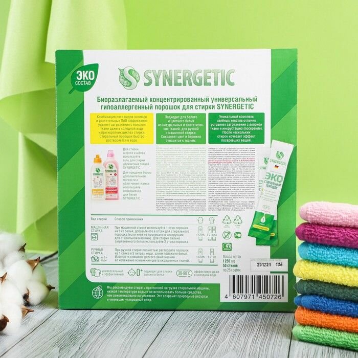 Биоразлагаемый концентрированный универсальный гипоаллергенный порошок для стирки SYNERGETIC. Способ применения: При машинной стирке используйте 1 стик порошка на 5 кг белья, добавьте его в отсек для стирального порошка (если иное не прописано в инструкции для стиральной машины). Для стирки сильно загрязненного белья используйте 2 стика порошка. При ручной стирке полностью растворите порошок из 1 стика в 5 литрах воды, затем положите бельё. Избегайте слишком долгого замачивания во избежание изменения цвета окрашенных тканей.