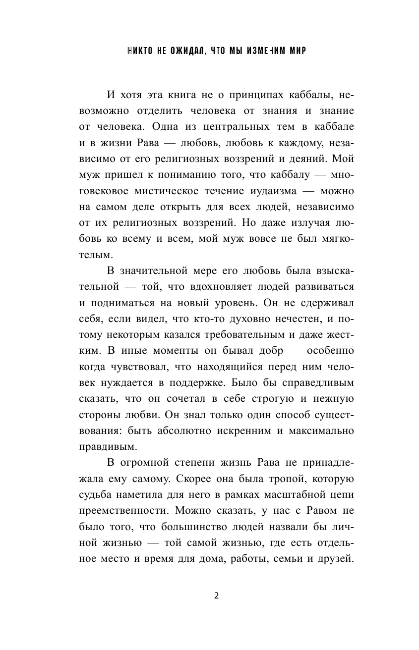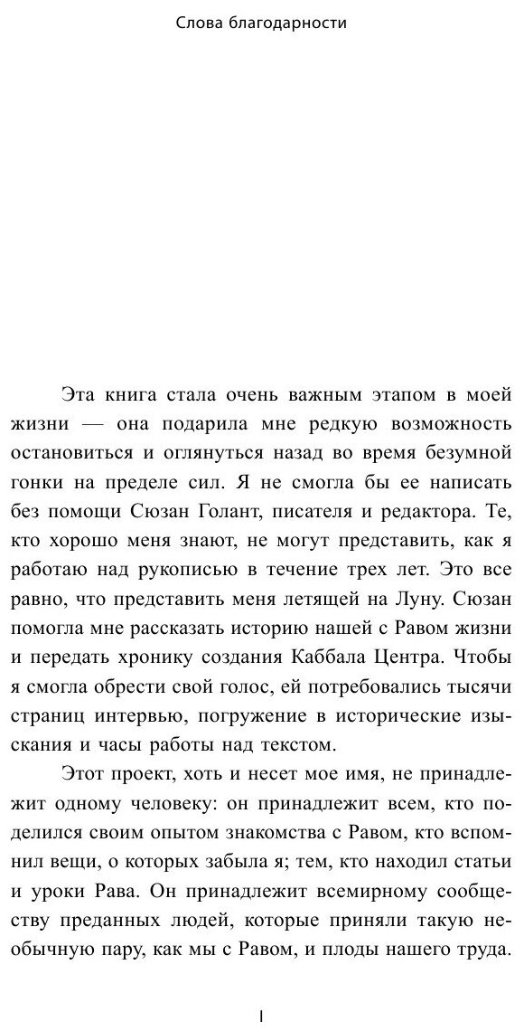 Благодаря этой книге Рав Берг и Карен открылись для меня совсем с другой стороны, с человеческой. И именно человеческая, бытовая даже сторона их жизни даёт больше о каббале, чем изучение трудов великих каббалистов. Возвышенная вселенская любовь и принятие, мужество и самоотверженность, преданность идеалам и миссии - стали для меня не просто словами, я прочувствовала и как бы вместе с Равом и Карен пережила их трудные и радостные моменты, ощутила запах дразнящих ароматов кошерной кухни и ласковый ветерок предзакатного Цфата. Эта книга о людях, которые сделали невероятное возможным, осуществив предсказанное за 2000 лет до их рождения. И это книга о Каббале, мудрости, сокрытой столетиями и раскрывшейся нам благодаря Раву и Карен Берг