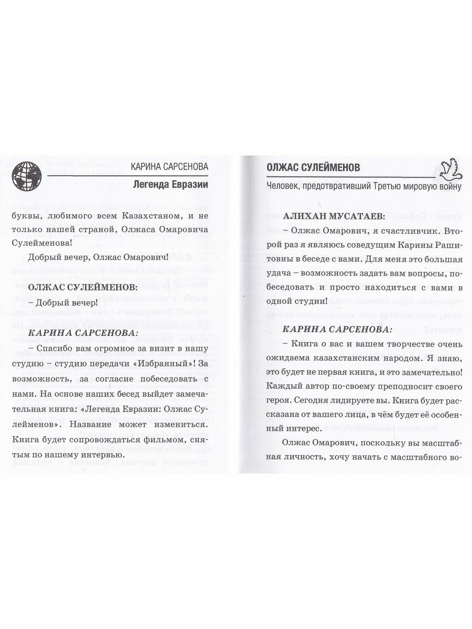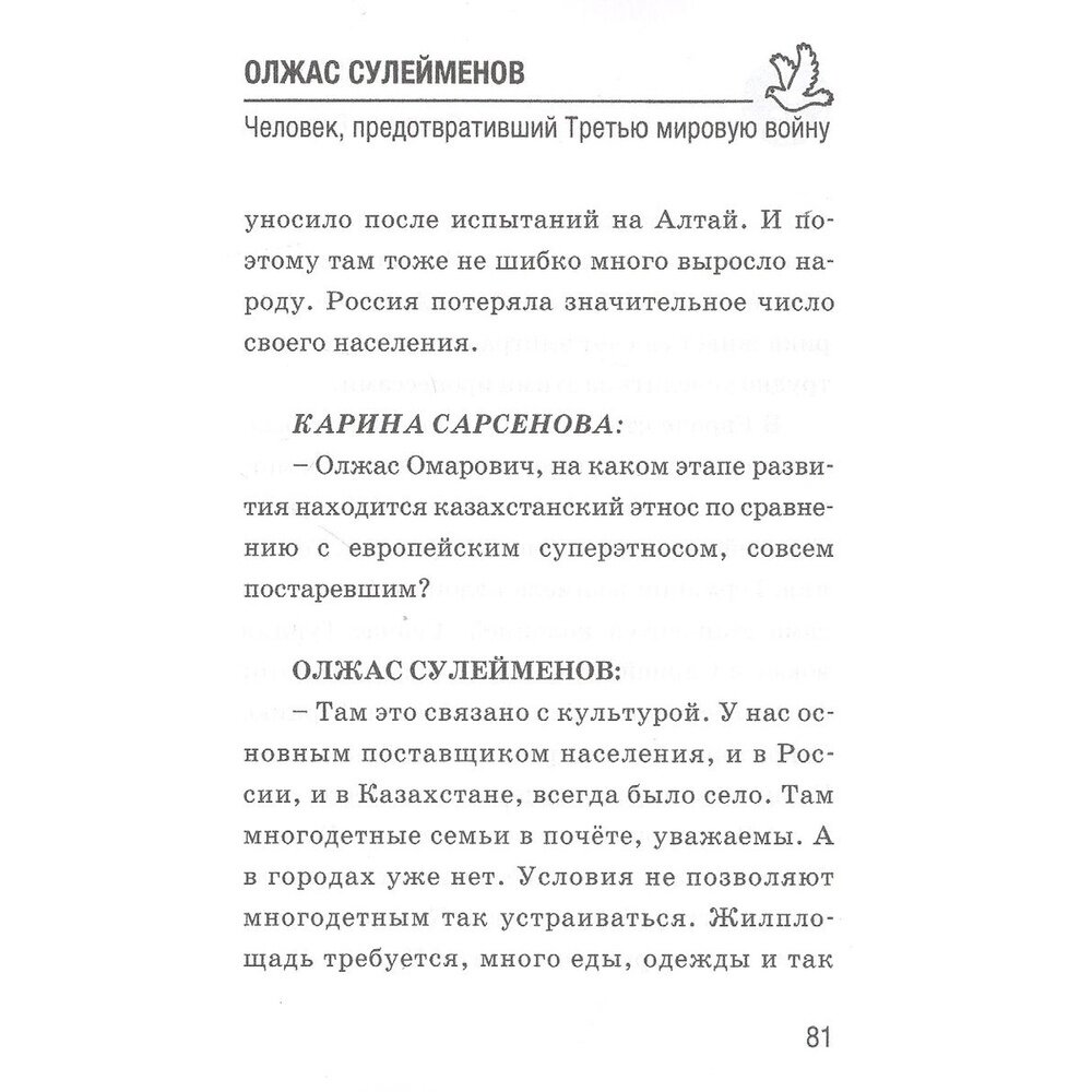 Тем интереснее встреча с легендой нашей современности, человеком-символом, человеком-эпохой! На вопросы Карины Сарсеновой блестяще отвечает Олжас Сулейменов – знаменитый советский и казахский поэт, прозаик, лингвист, переводчик, политик, дипломат, мудрец и аксакал, заставляющий размышлять и делать выводы. В 1975 г. вышла его нашумевшая книга «Аз и Я», ставшая выдающимся литературно-филологическим событием. А сейчас он ставит вопрос об осознании «идеологии взаимозависимости», которая должна привести к благоденствию каждой нации, каждого народа и каждого государства.