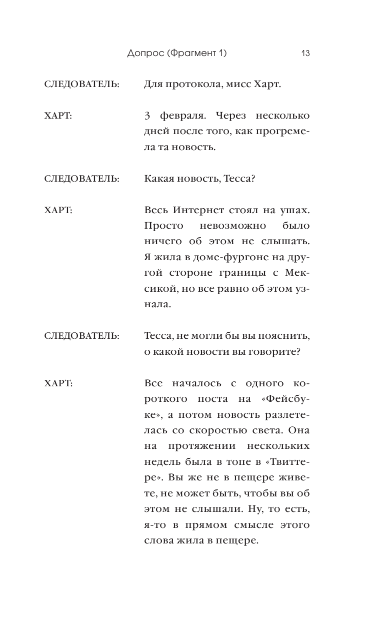 Любовь. Одержимость. Ревность. Убийство Тесса: Snowflake734 Поп-звезда Эрик Торн исчез. В его аккаунте "Твиттера" @EricThorn давно нет никакой активности. Мобильный телефон разбит и найден в снегу весь в крови. Никто не знает, что случилось с Эриком. Никто, кроме меня, Тессы Харт. У меня агорафобия, и я – самая преданная его фанатка. Даже больше, чем просто фанатка… Но теперь в "Твиттере" я не появляюсь. Ведь "Снэпчат" гораздо безопаснее?.. Дориан Кромвель: ShowYouTheDor Я не умер. Да, одержимость фанаток до добра не доводит, но и до смерти – тоже. Этот тайм-аут пошел мне на пользу. Давление прессы, бесконечные преследования… Такие, как я, не могут просто уйти на покой и скрыться во мраке. Эрик должен меня понять. Кстати, Эрик! Я не знаю, жив ты или нет, но нам срочно нужно встретиться. Это очень важно! Я должен тебя кое о чем предупредить… Доверься мне.