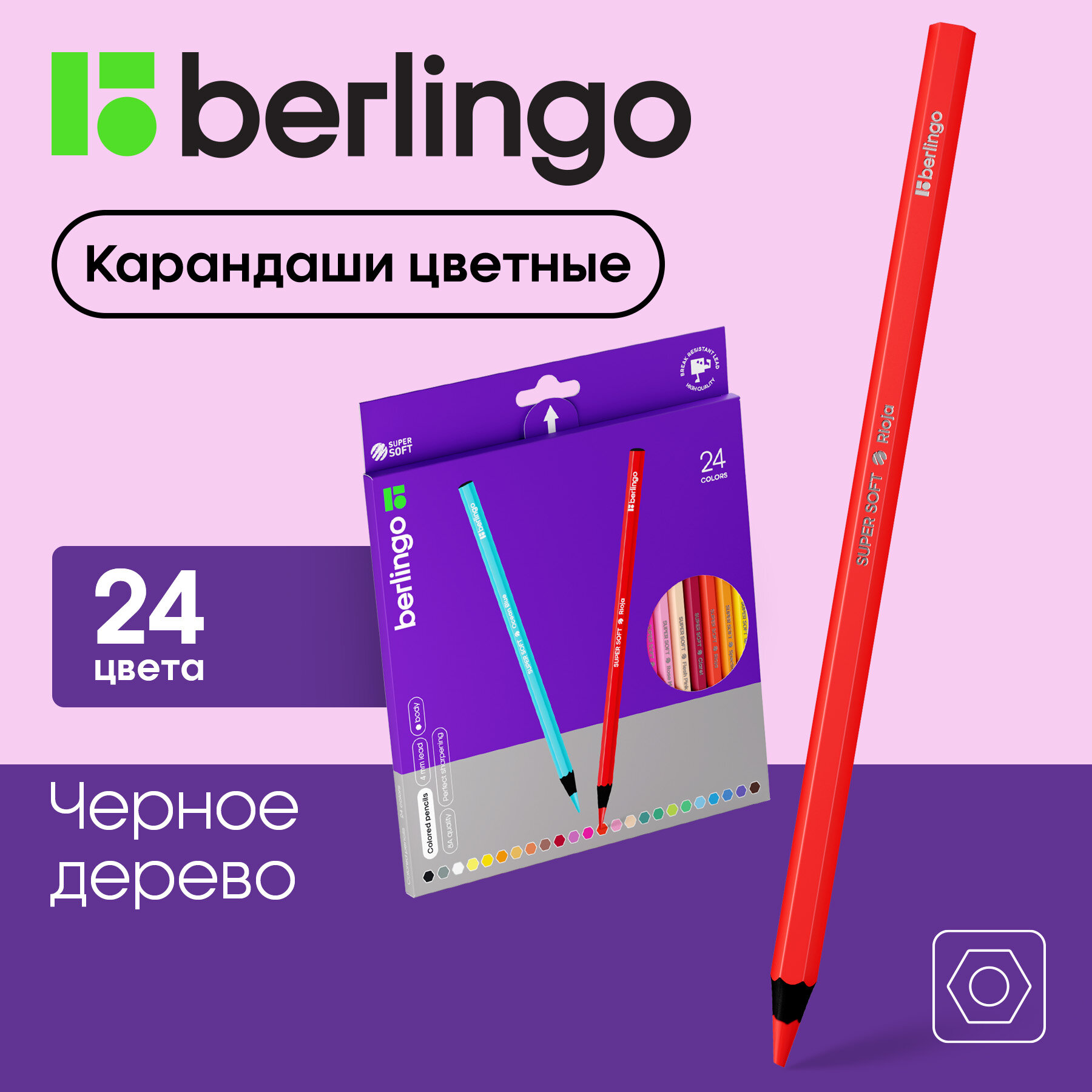 Набор карандашей Berlingo SuperSoft SS01824 шестигранный дерево 7мм 24 цв. картонная упаковка 24шт Карандаши цветные SuperSoft Blackwood заточенные 24 цвета