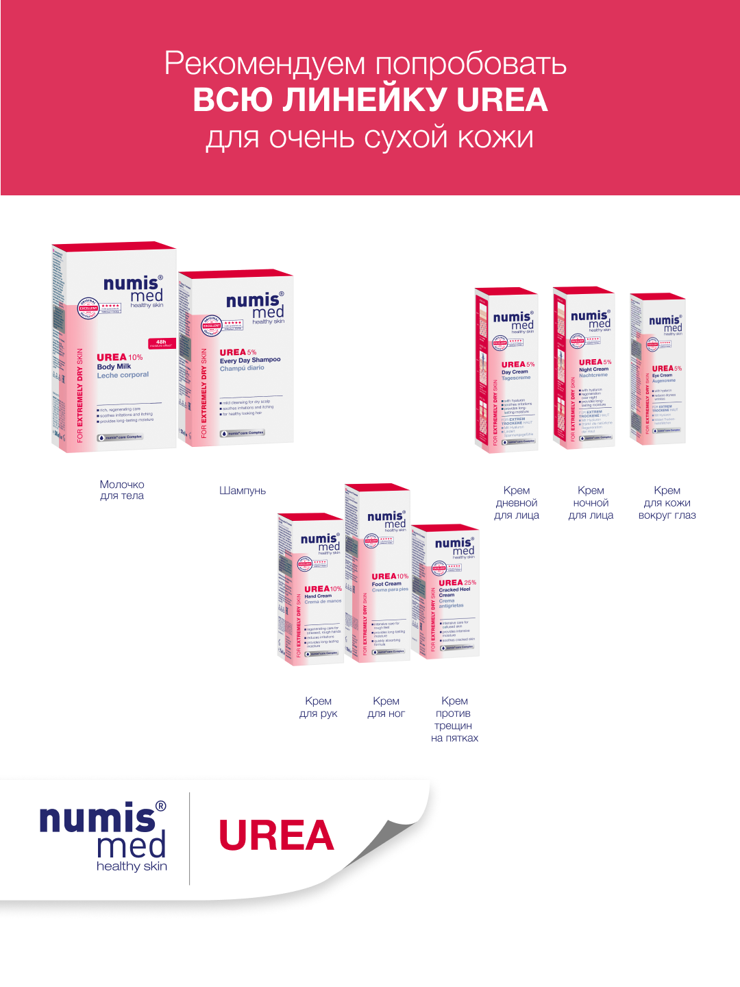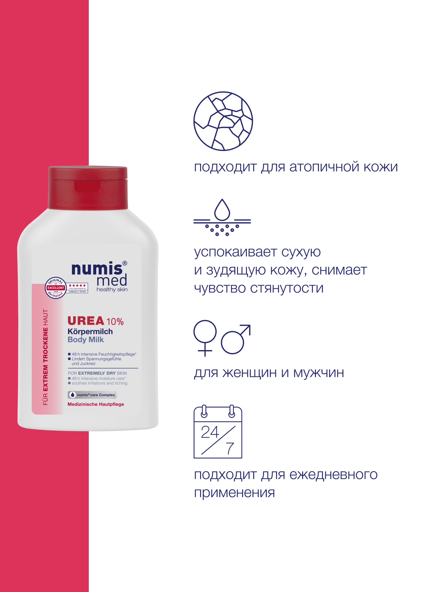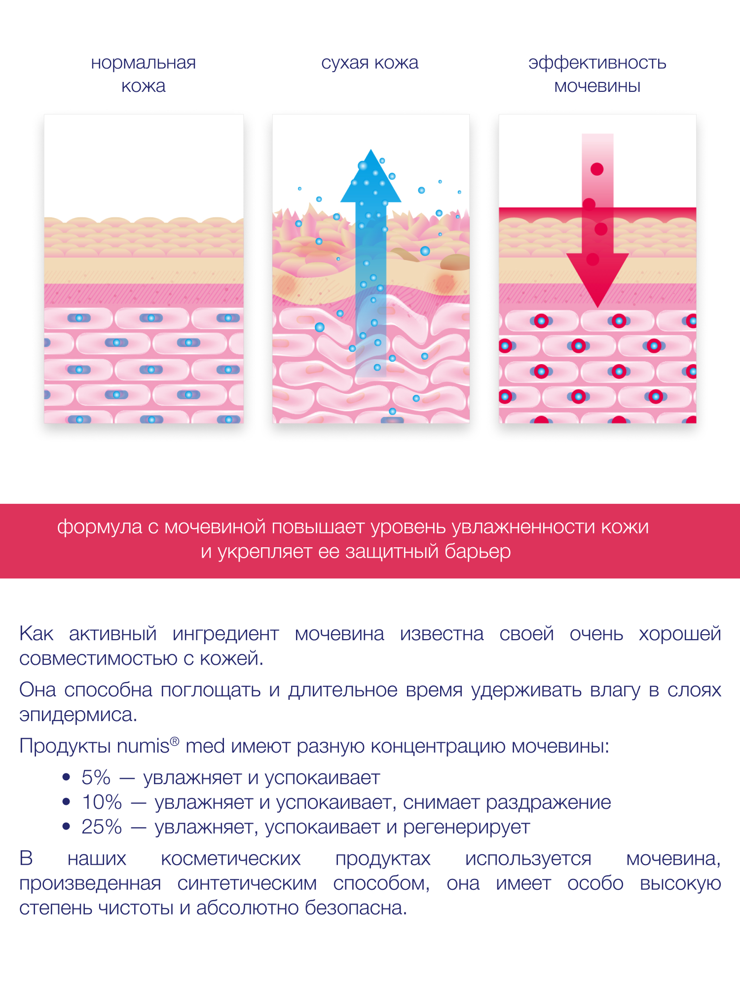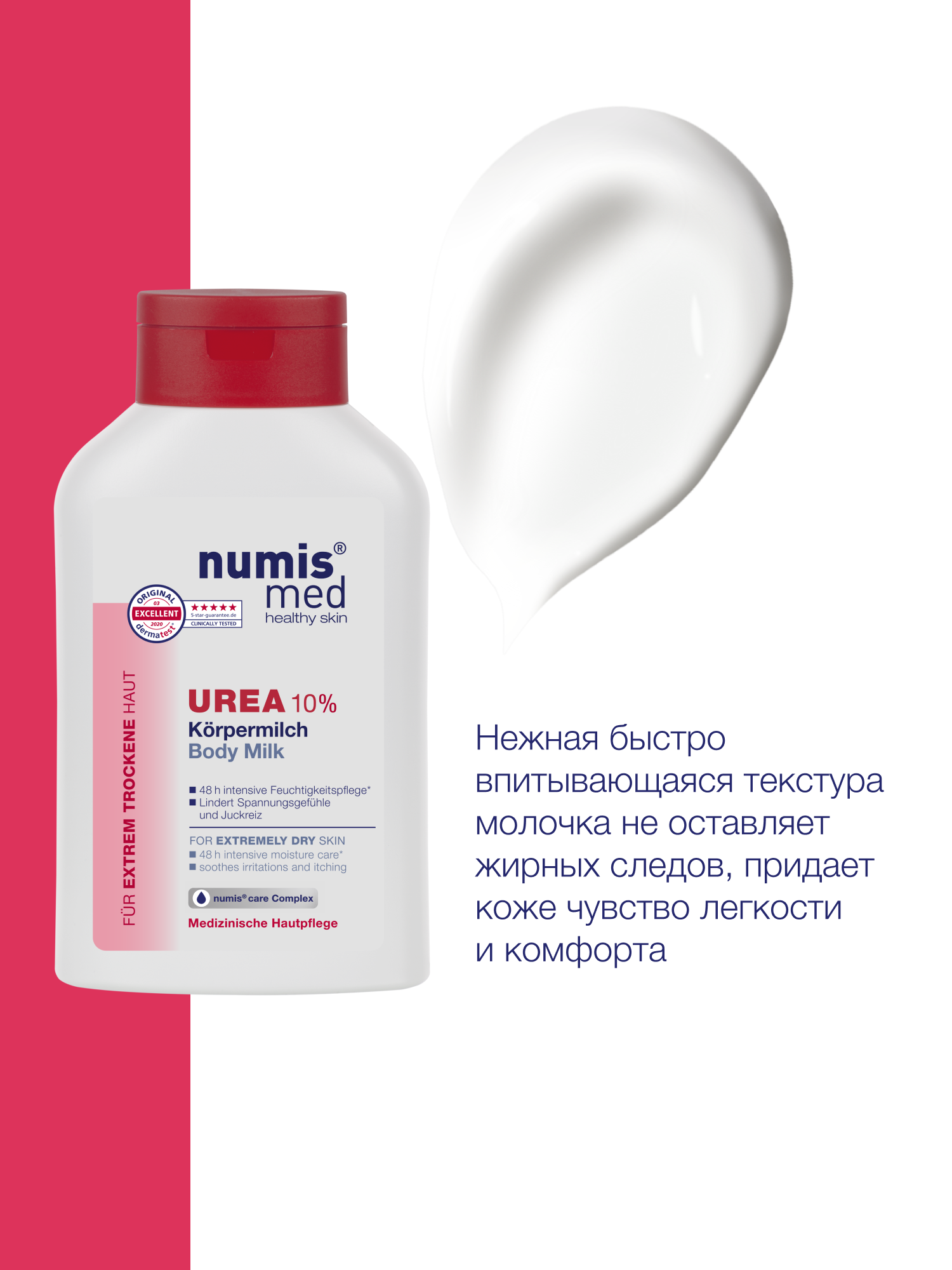 Молочко для тела с 10 % мочевиной Нумис Мед используется в качестве дополнительного ухода за кожей с различными косметическими дефектами, связанными с шелушением, повышенной сухостью, шероховатостью кожи. Быстро впитывается. Успокаивает кожу. Придает ощущение интенсивного увлажнения кожи, восстановления ее гладкости и эластичности. После применения данного продукта даже чрезвычайно сухая кожа хорошо защищена от дальнейшего обезвоживания и неблагоприятных воздействий окружающей среды. Без отдушки. Дерматологически тестировано. Благодаря своим интенсивным увлажняющим свойствам мочевина и глицерин защищают кожу и уменьшают чувство напряжения и стянутости. Молочко образует на поверхности кожи защитную пленку, которая заметно смягчает сухую кожу, уменьшает раздражение и зуд.