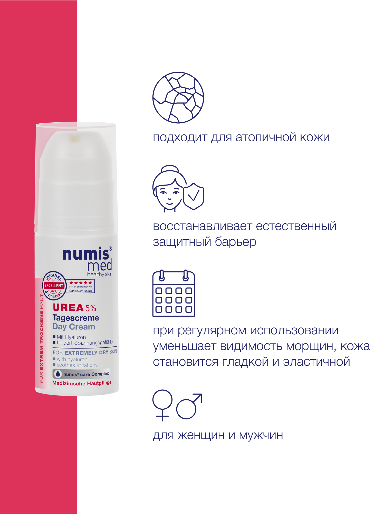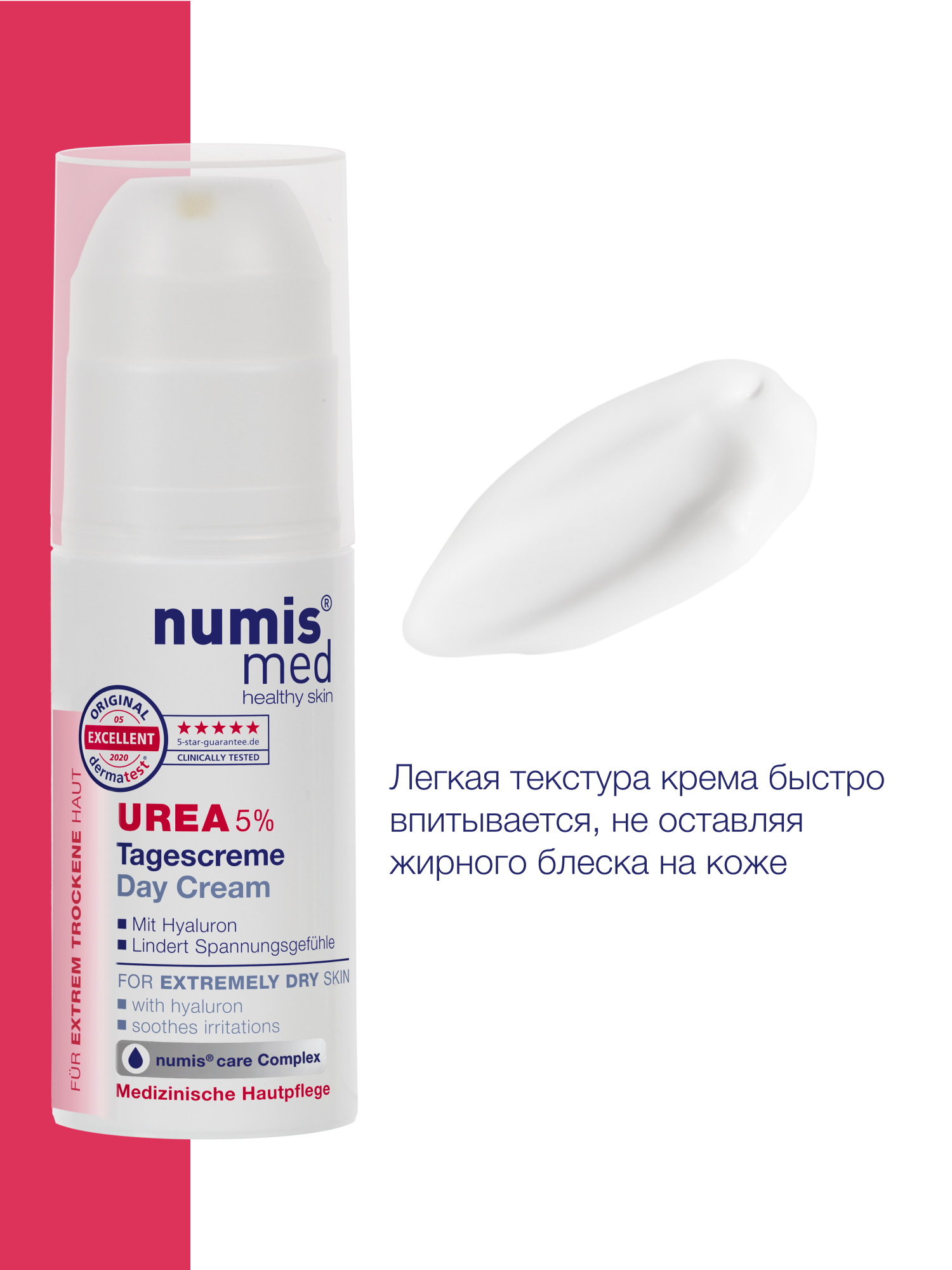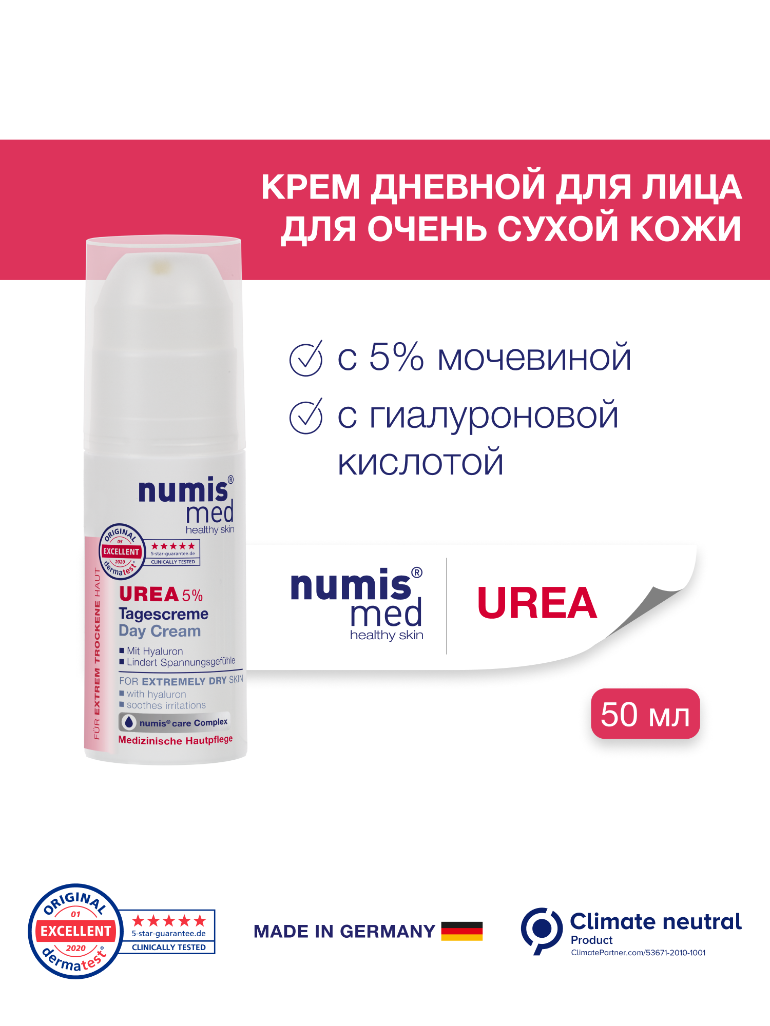 Дневной крем с 5 % мочевиной и гиалуроновой кислотой Numis Med для деликатного ухода за кожей лица, подходит и для гиперсухой, проблемной кожи, склонной к раздражениям и зуду. Этот крем содержит активно увлажняющую мочевину и гиалуроновую кислоту и тем самым надолго обеспечивает кожу влагой. Результат: кожа лица чувствует себя менее стянутой и приобретает молодой вид. Приятная текстура особенно хорошо подходит в качестве основы для макияжа. Это специальное средство по уходу за очень сухой, чувствительной кожей лица, которое содержит высокоэффективную мочевину и гиалуроновую кислоту. Используется в качестве дополнительного ухода за кожей с различными косметическими дефектами, связанными с шелушением, повышенной сухостью, шероховатостью кожи. Этот питательный крем с высокоэффективной мочевиной и гиалуроновой кислотой дарит ощущение интенсивного увлажнения даже очень требовательной коже. Профилактика дискомфорта при раздражениях и зуде. Ваша кожа чувствует себя ухоженной, более гладкой и