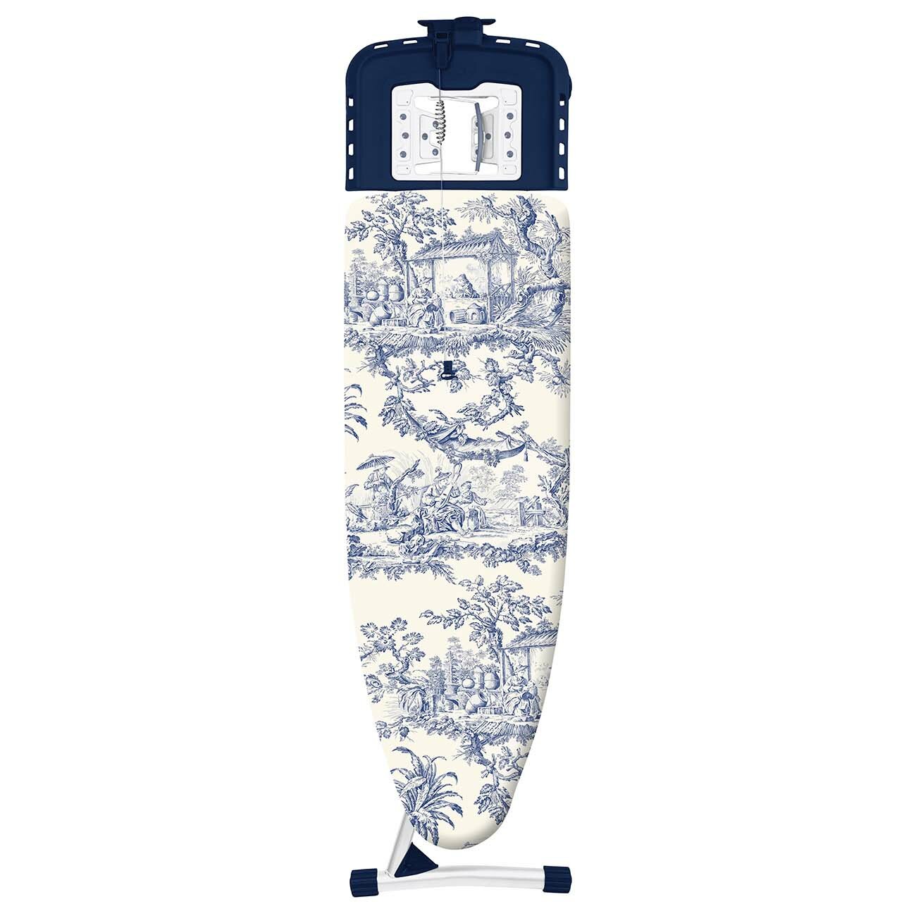 Рабочая поверхность составляет 122 см в длину и 42 см в ширину. Этого достаточно, чтобы разместить на ней даже брюки высокого человека. Для рукавов предусмотрена специальная подставка, позволяющая качественно прогладить все труднодоступные участки. Внизу имеется полка, куда можно складывать вещи. В комплекте идёт чехол из прочного хлопка, который сохраняет форму даже под воздействием высокой температуры. К тому же она моментально впитывает влагу и подходит для использования с утюгами с парогенератором. Прорезиненные ножки исключают скольжение по полу в процессе глажки.Вес модели — всего 8 кг, поэтому её можно без проблем переносить. Ножки-подставки складываются за пару секунд, что обеспечивает экономию пространства в доме.