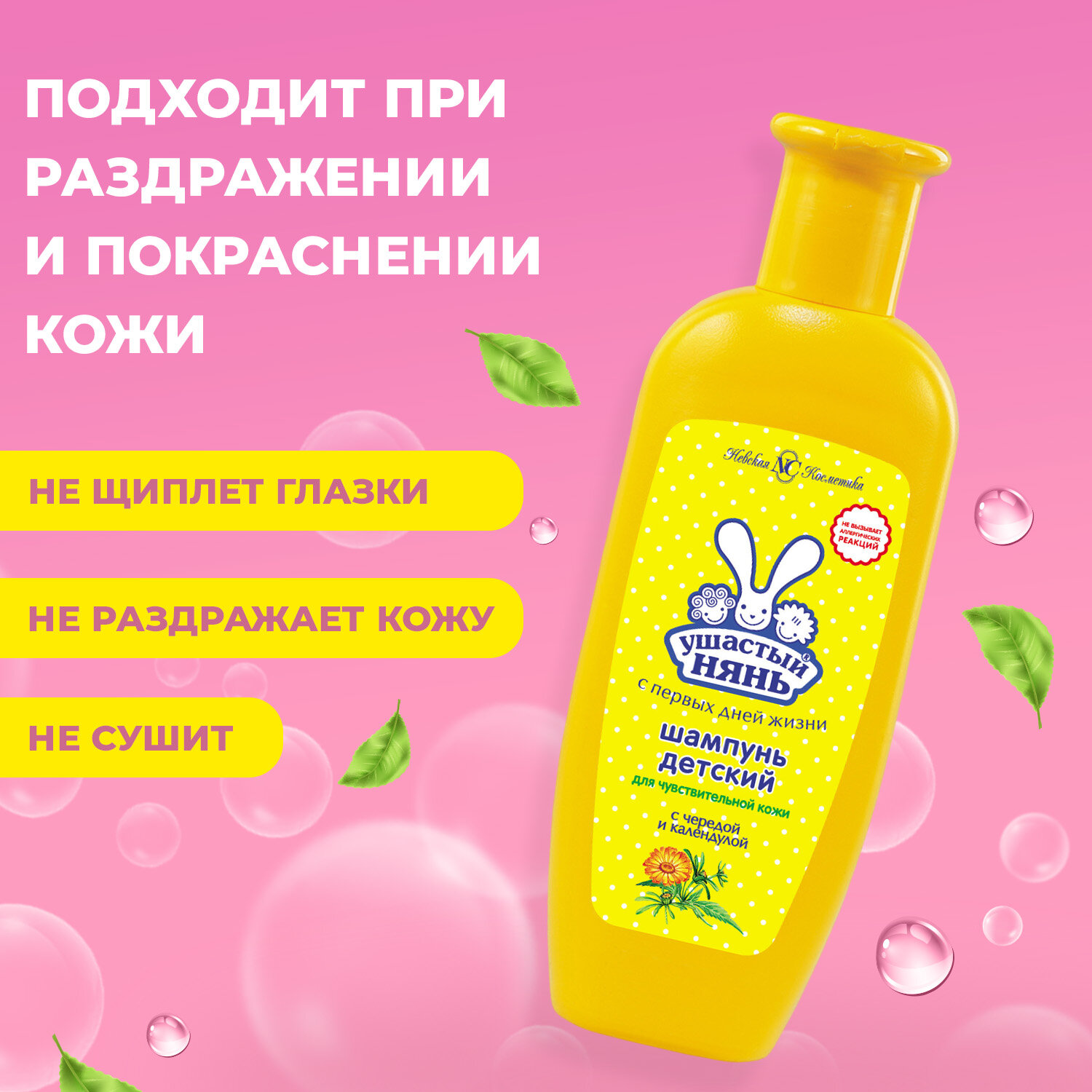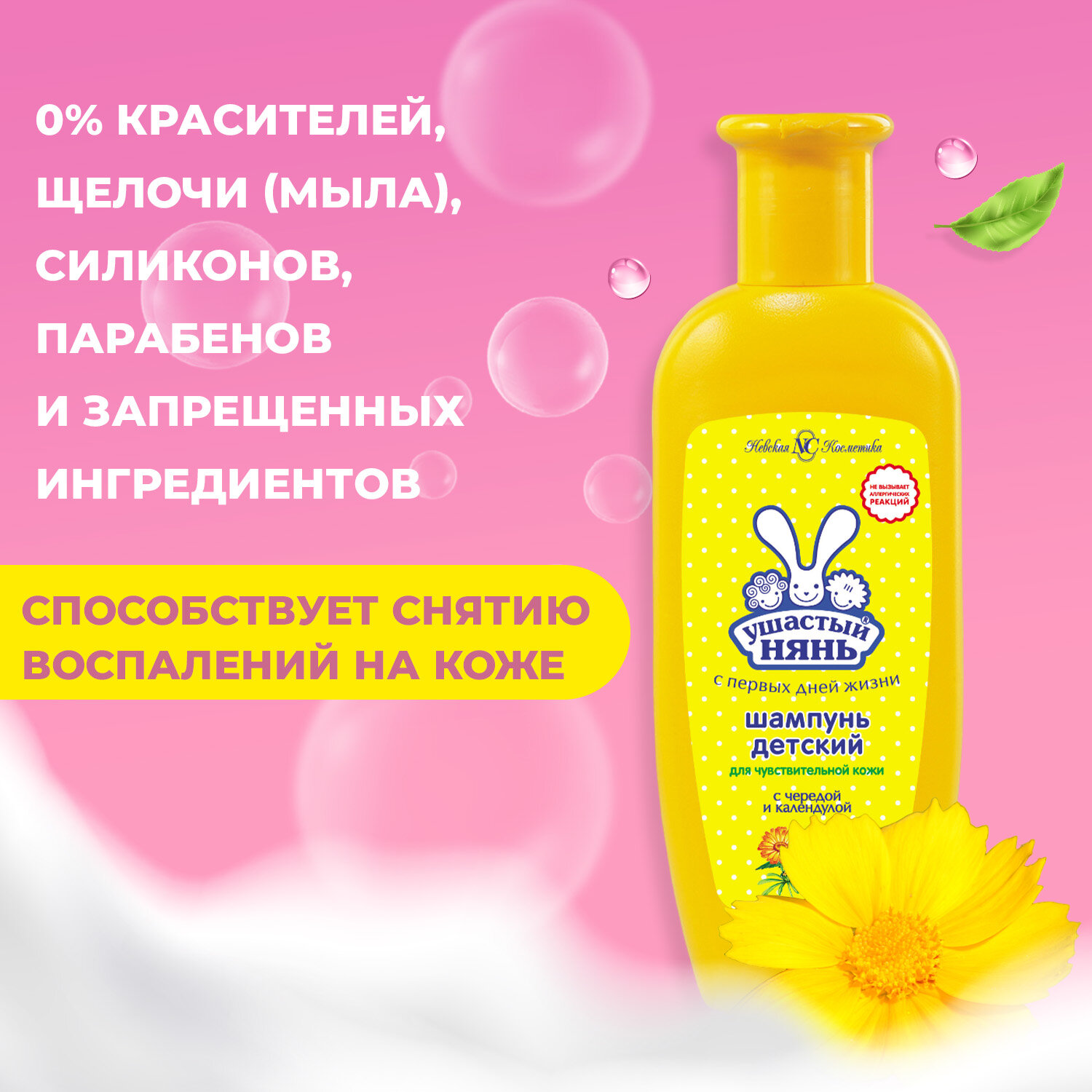 | Особенности | увлажнение, очищение, смягчение, питание, от раздражения, без слез, укрепление, гипоаллергенно, антисептический эффект, против воспалений |