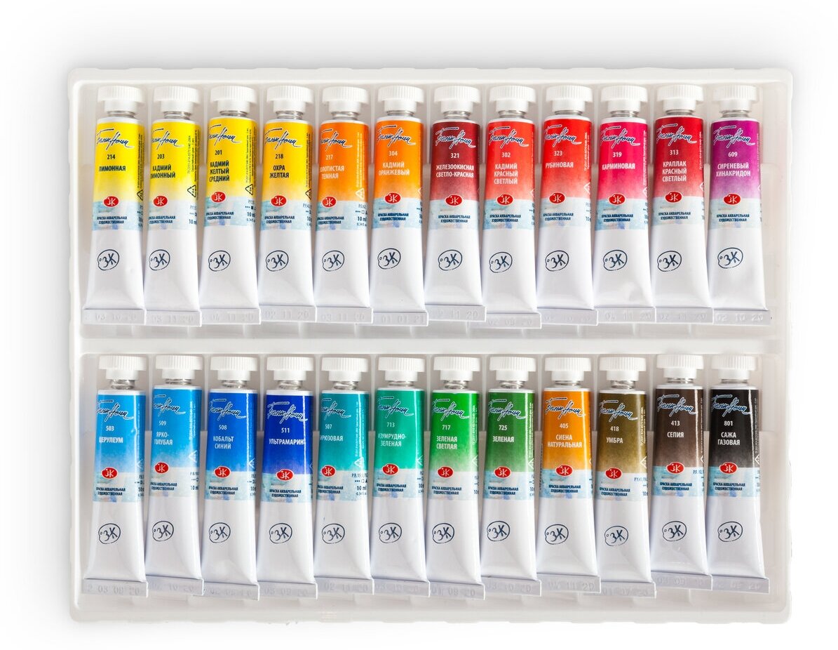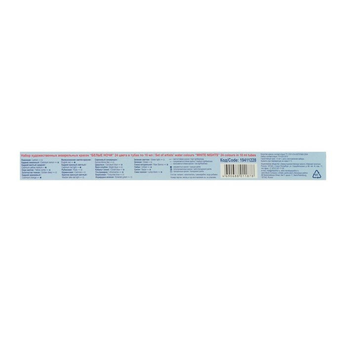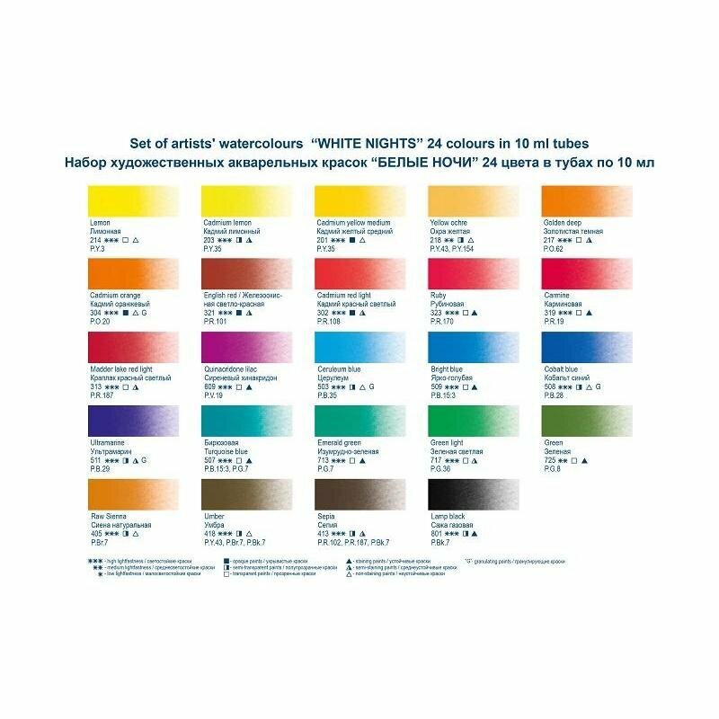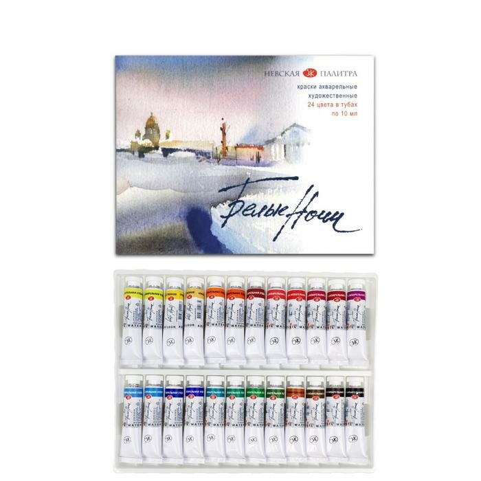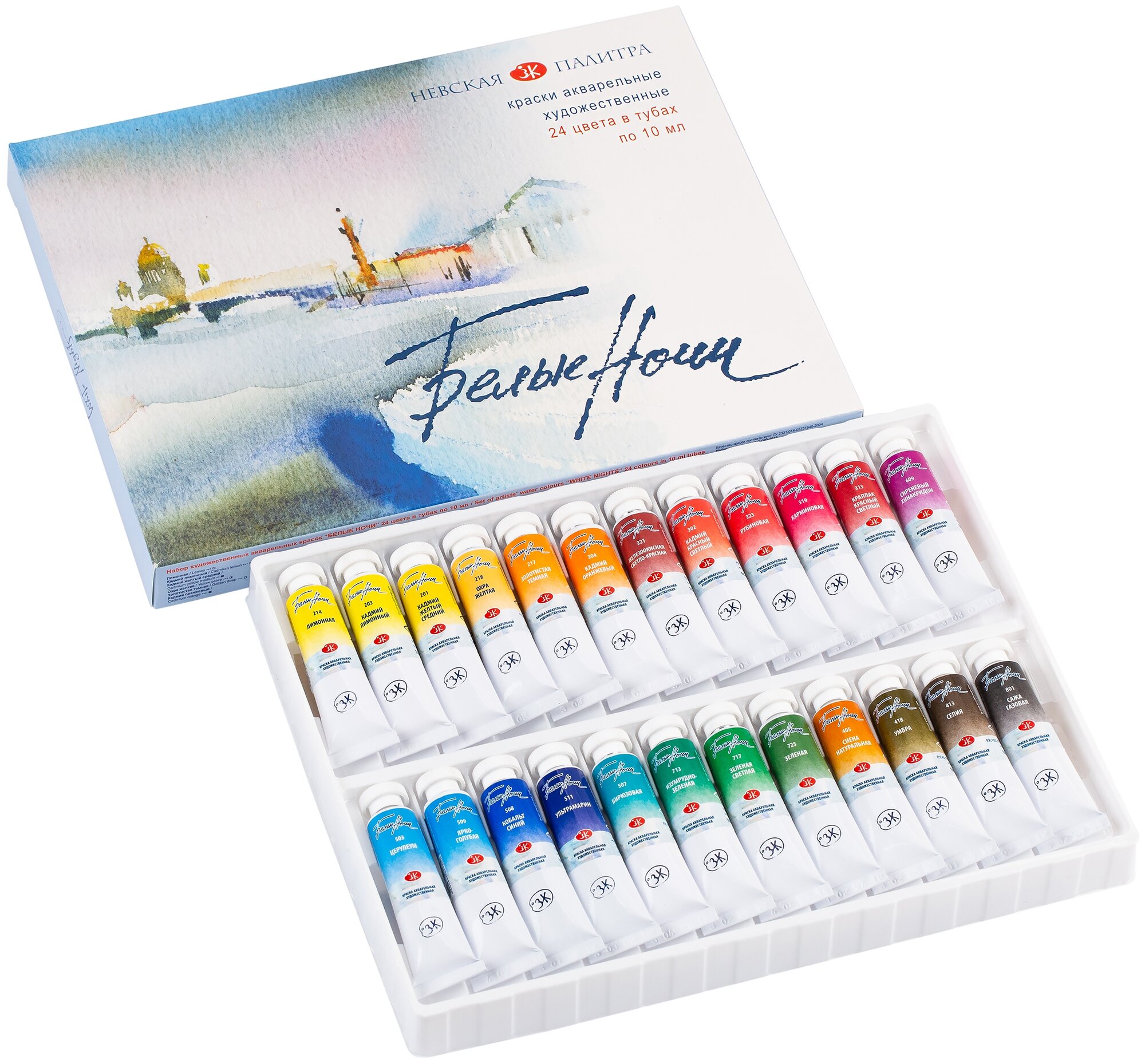 Краски в тубах обладают пастообразной консистенцией, не требуют дополнительного размачивания водой и сразу готовы к применению. Рекомендуются для живописи на больших форматах, для смешивания красочных растворов, для заливок больших участков бумаги, для заполнения пустых кювет. Сбалансированная палитра из 24 цветов в наборе «Белые ночи» позволяет решить множество творческих задач акварелиста. Набор представлен в пластиковом коррексе и картонном чехле.