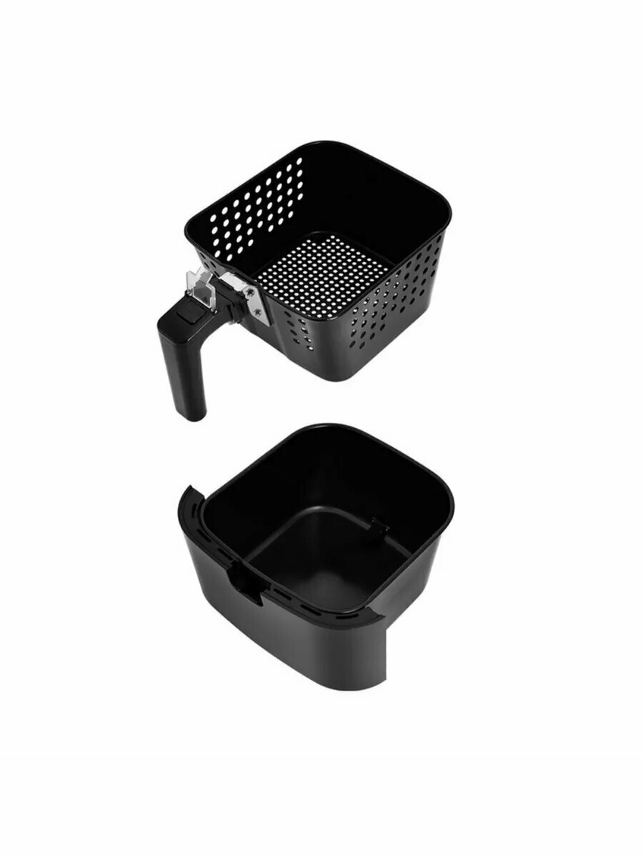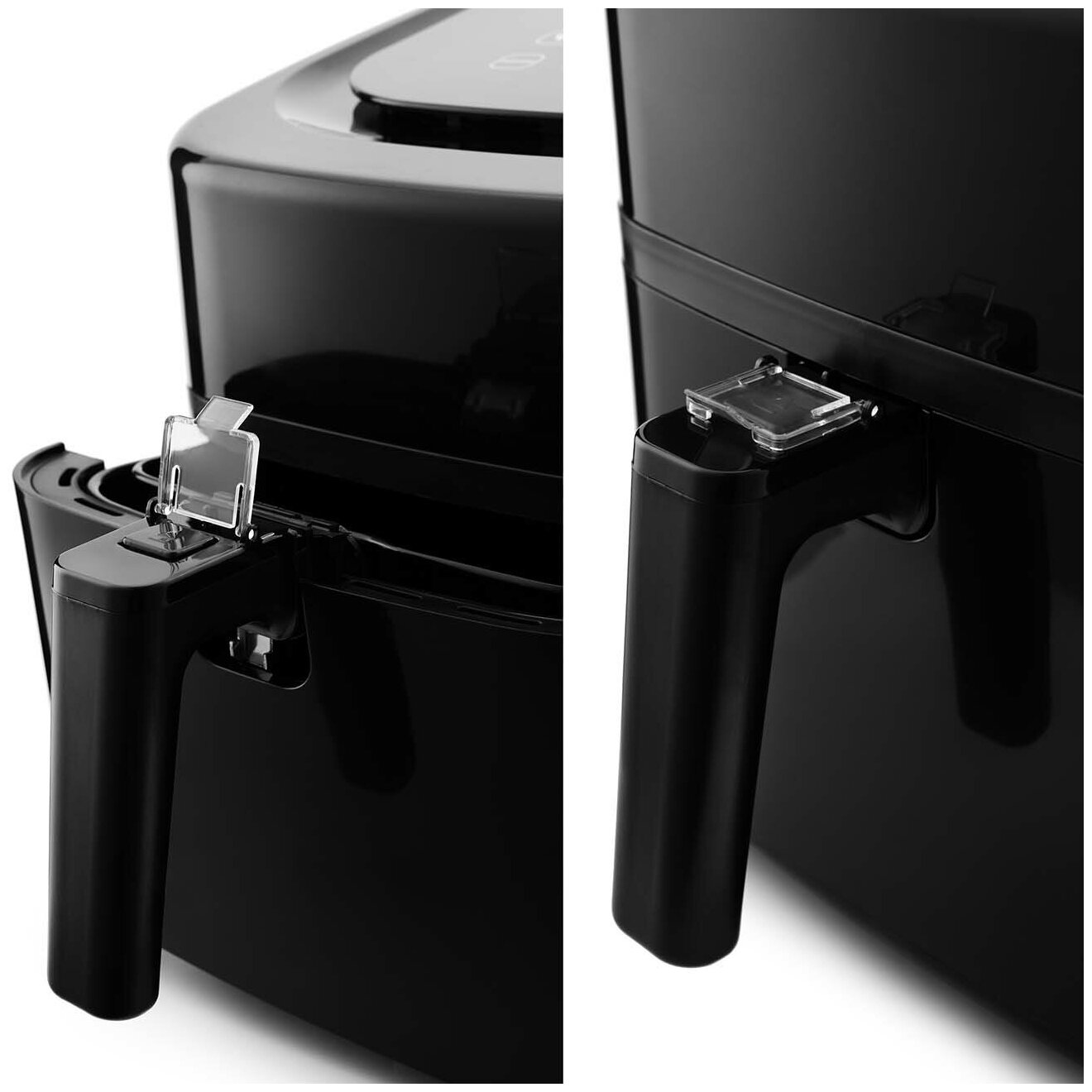 Во избежание случайного нажатия кнопки извлечения корзины из поддона, на ручке прибора предусмотрена предохранительная крышка. Аэрогриль имеет оригинальную форму и лаконичный дизайн. Благодаря форме корпуса он отлично впишется в вашу кухню и не займёт много места.