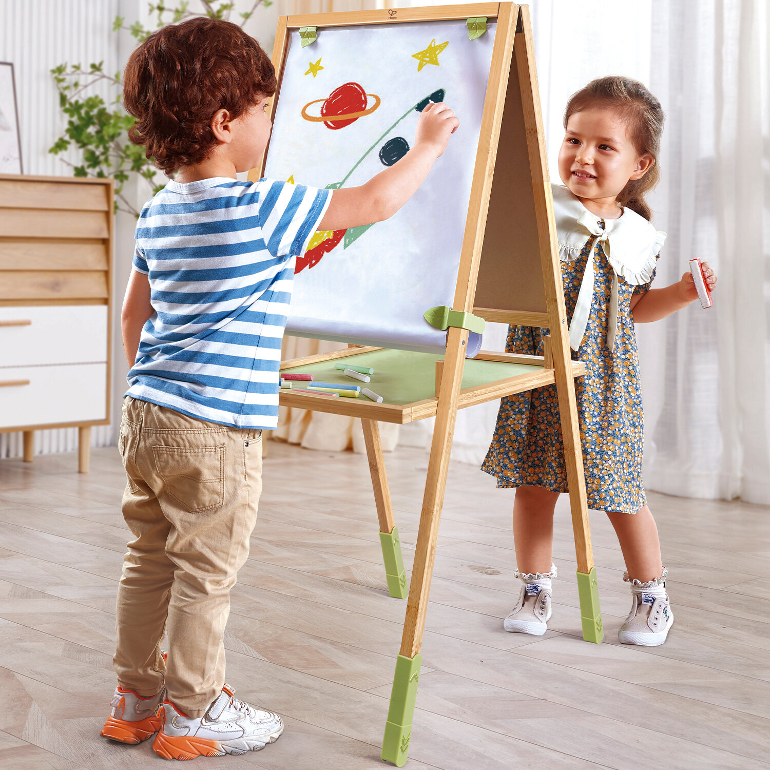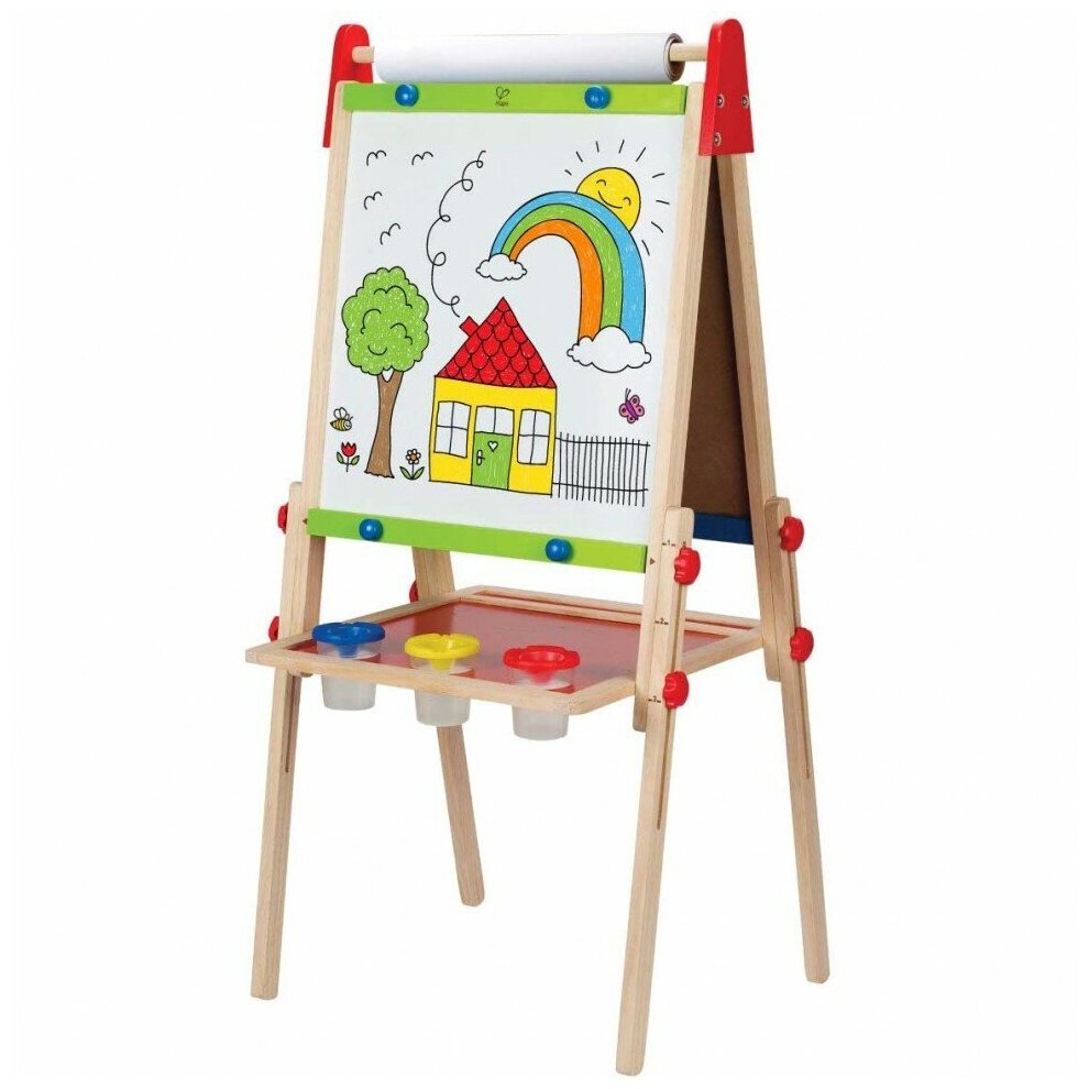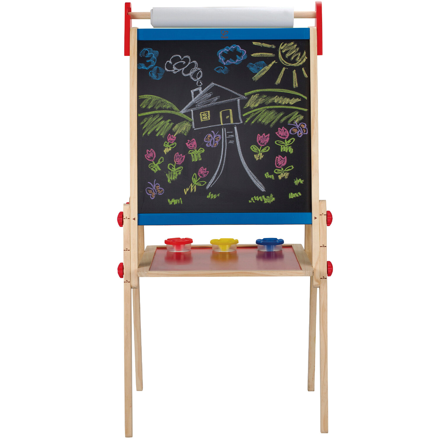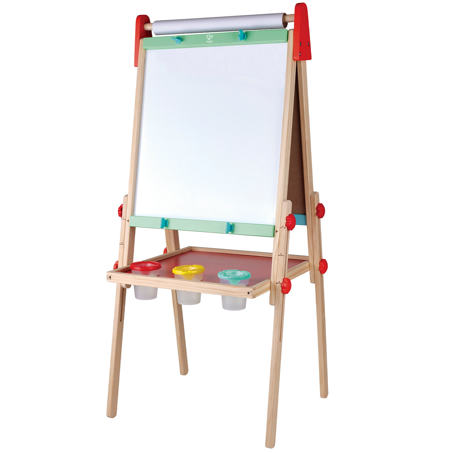 Рисуйте, пишите или рисуйте мелом. В этом двухстороннем деревянном мольберте с регулируемой высотой найдется место для всего. В набор входит:3 банки для краски, двухсторонний мольберт, магнитная доска и рулон бумаги. Высота регулируется.