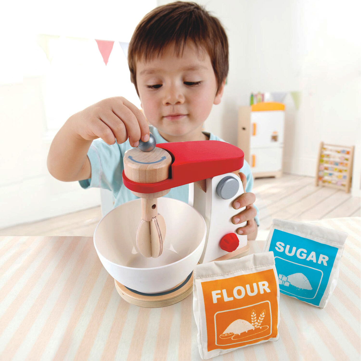 С помощью блендера дети могут делать вид, что пекут, используя свои собственные пакеты с мукой и сахаром, миску и поворотный блендер.