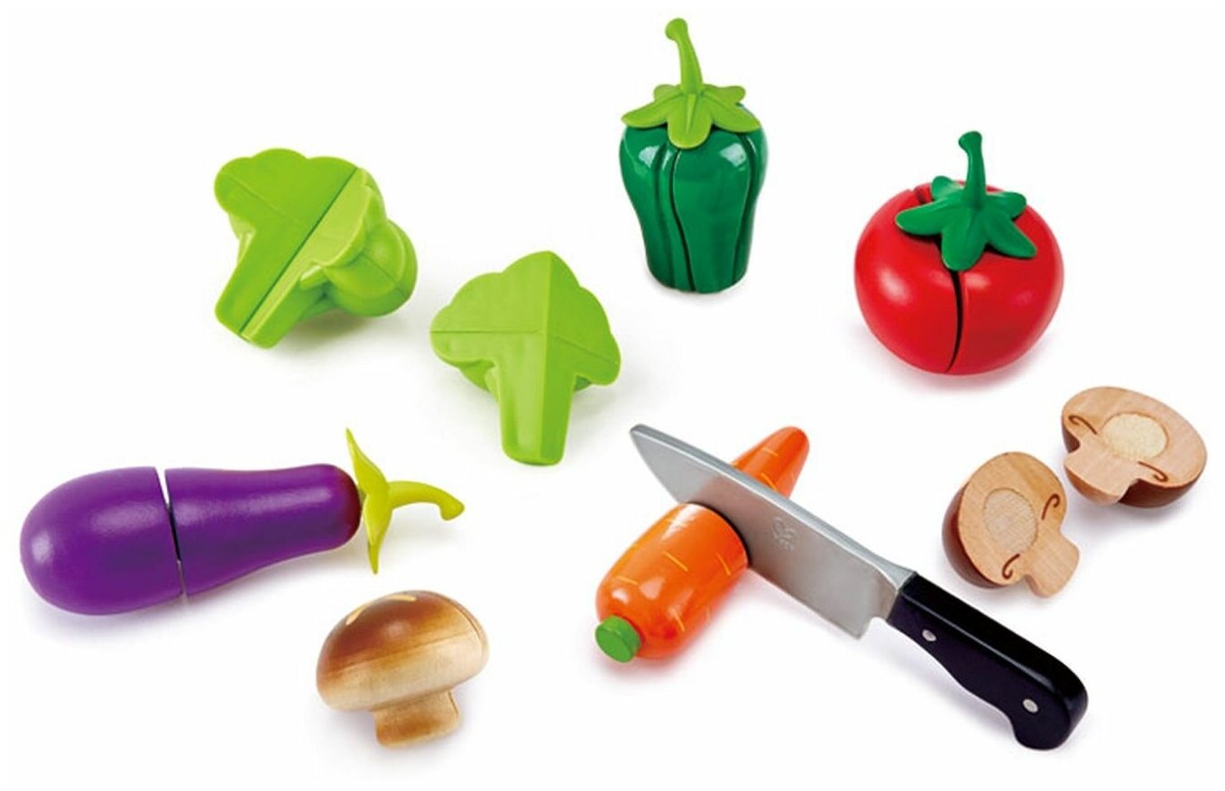 Нет ничего полезнее свежих овощей! Обрежьте стебли, а затем используйте игровой нож, чтобы нарезать зеленый перец, помидоры и многое другое. Овощи удерживаются вместе с самоклеющимися вкладками и распадаются для еще более реалистичности.