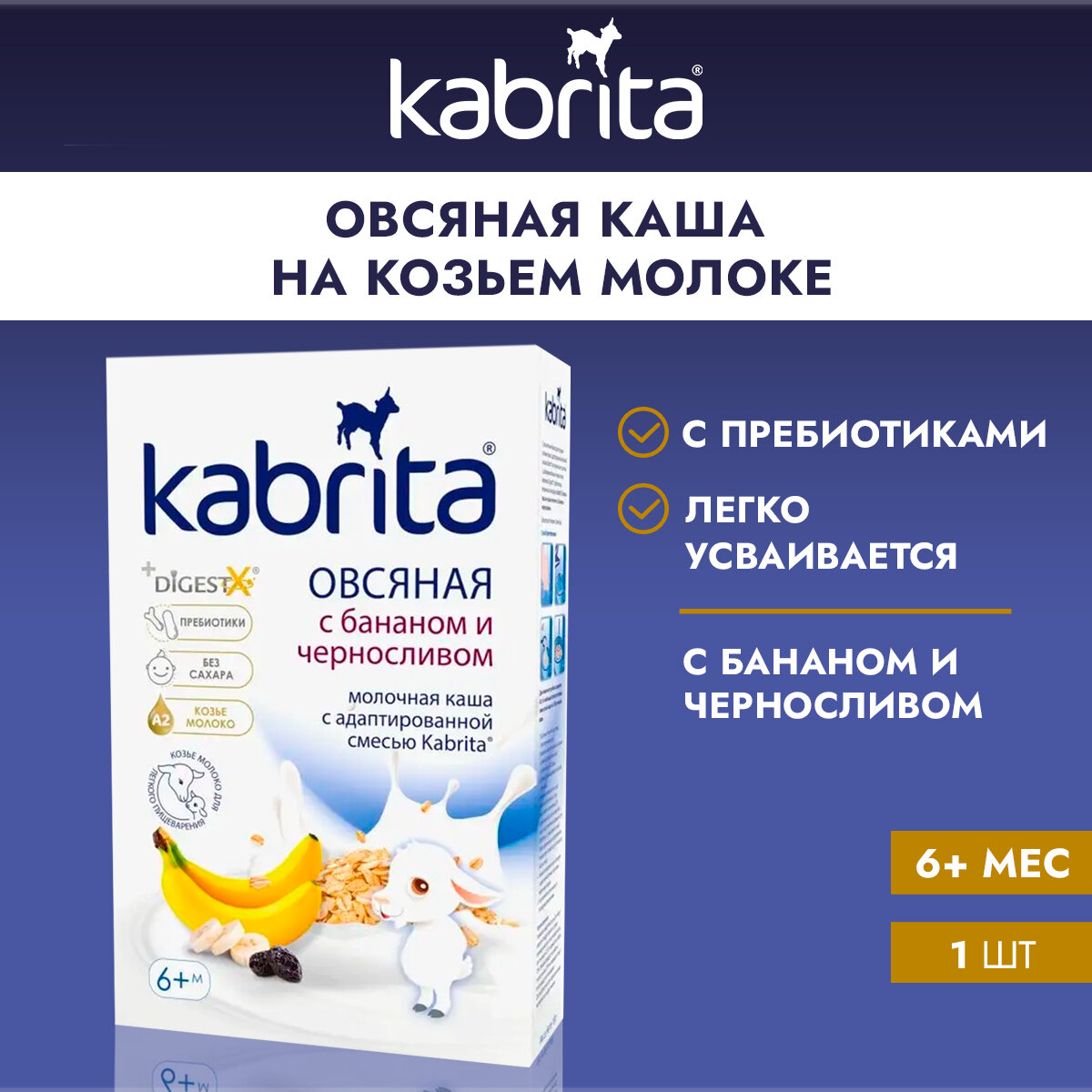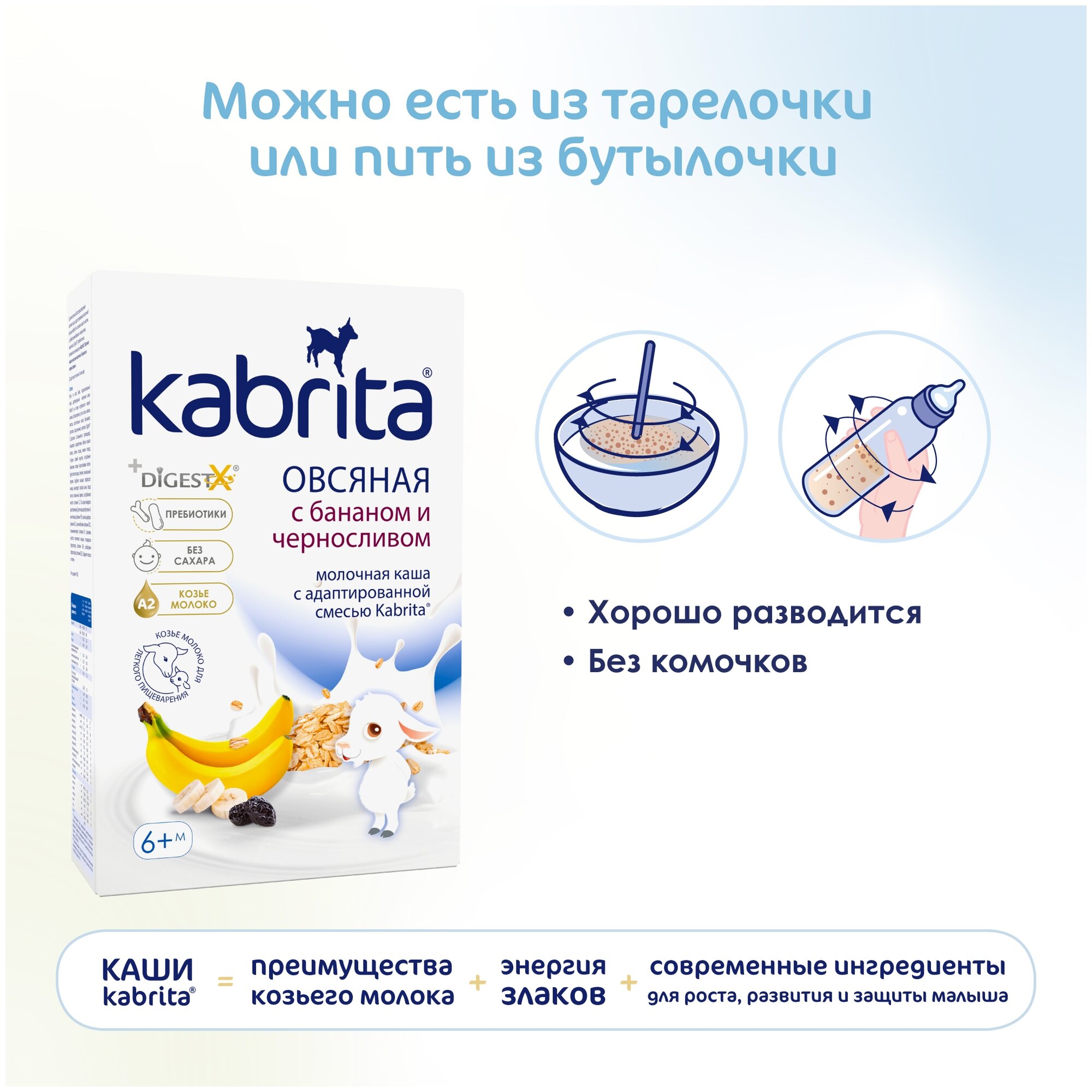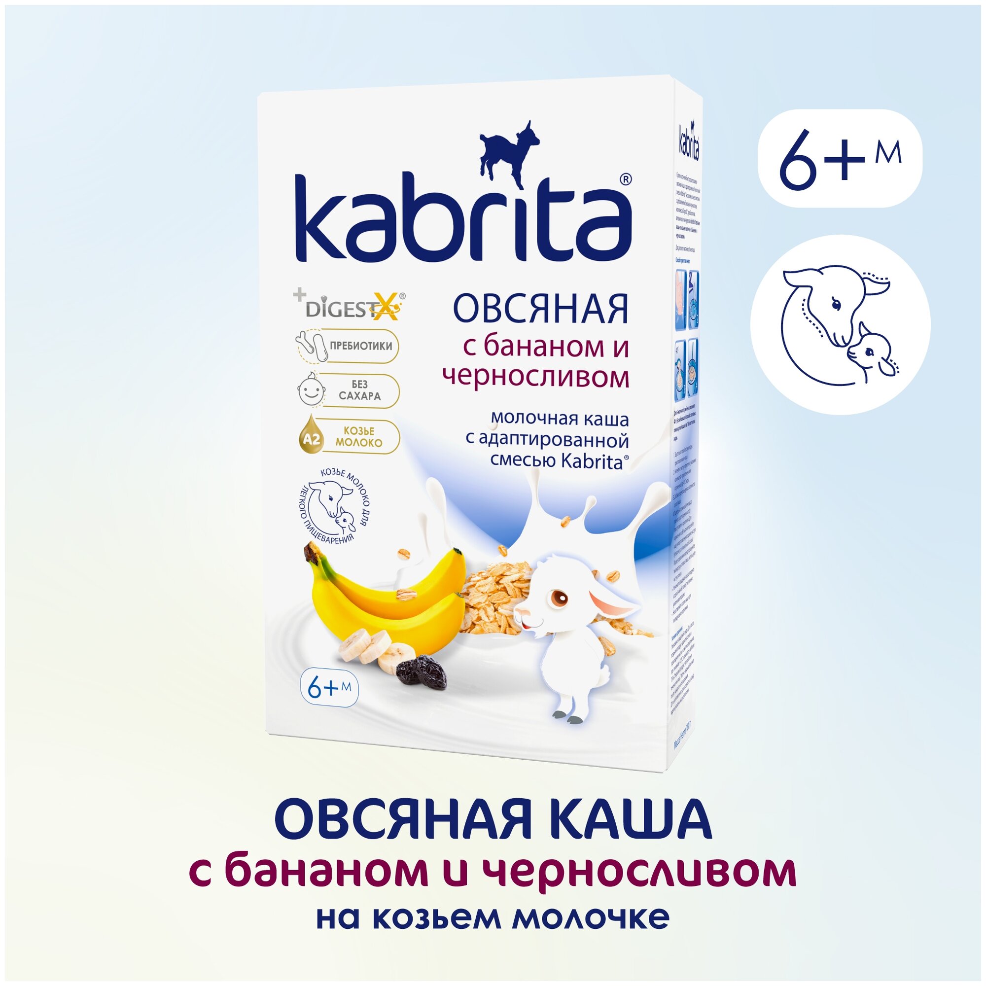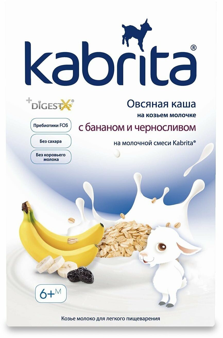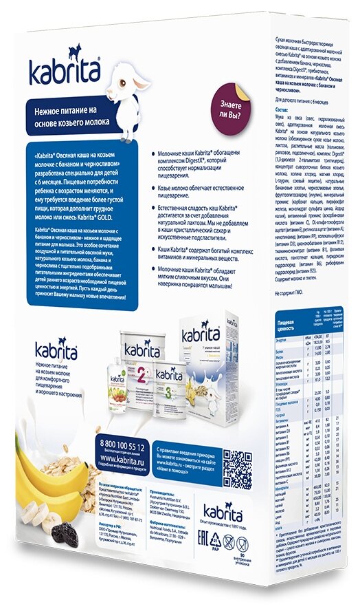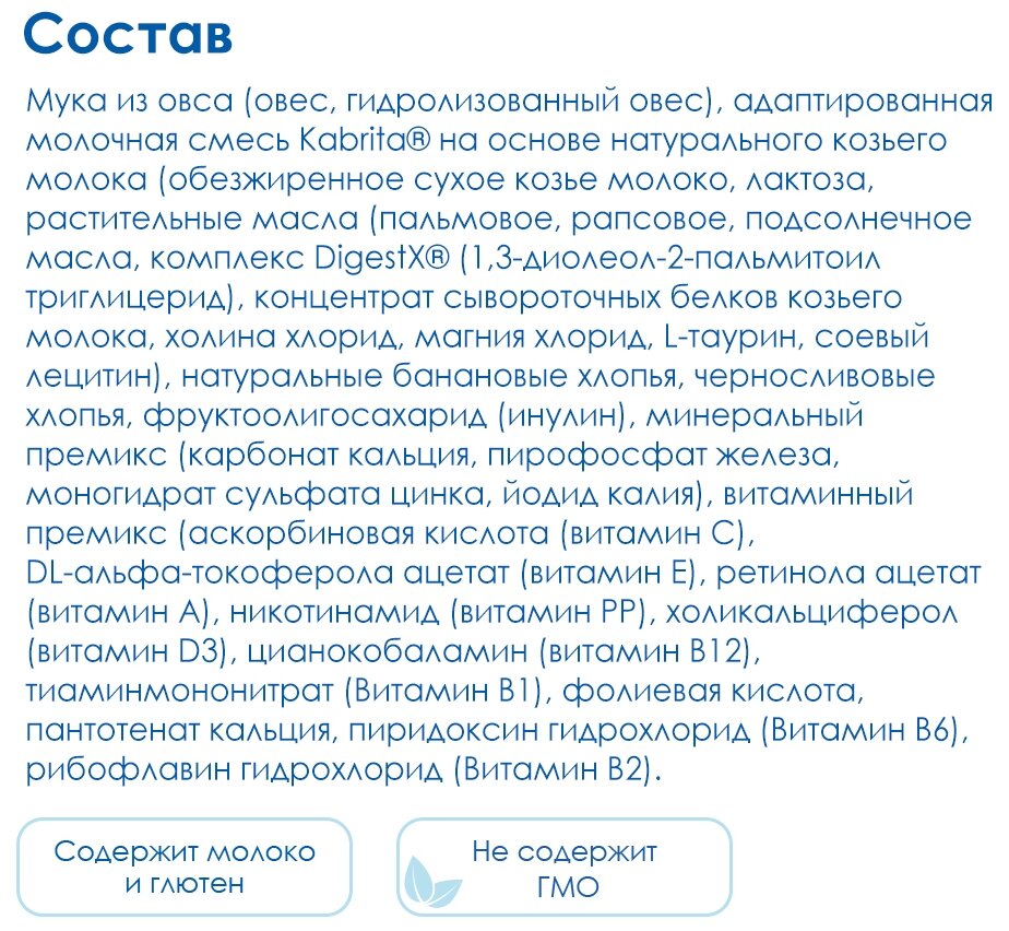 | Состав | мука из овса (овес, гидролизованный овес), адаптированная молочная смесь Kabrita на основе натурального козьего молока (обезжиренное сухое козье молоко, лактоза, растительные масла (пальмовое, рапсовое, подсолнечное масла, комплекс DigestX (1,3-диолеол-2-пальмитоил триглицерид), концентрат сывороточных белков козьего молока, холина хлорид, магния хлорид, L-таурин, соевый лецитин), натуральные банановые хлопья, черносливовые хлопья, фруктоолигосахарид (инулин), минеральный премикс (карбонат кальция, пирофосфат железа, моногидрат сульфата цинка, йодид калия), витаминный премикс (аскорбиновая кислота (витамин С), DL-альфа-токоферола ацетат (витамин E), ретинола ацетат (витамин A), никотинамид (витамин PP), холикальциферол (витамин D3), цианокобаламин (витамин В12), тиаминмононитрат (Витамин B1), фолиевая кислота, пантотенат кальция, пиридоксин гидрохлорид (Витамин B6), рибофлавин гидрохлорид (Витамин В2 |