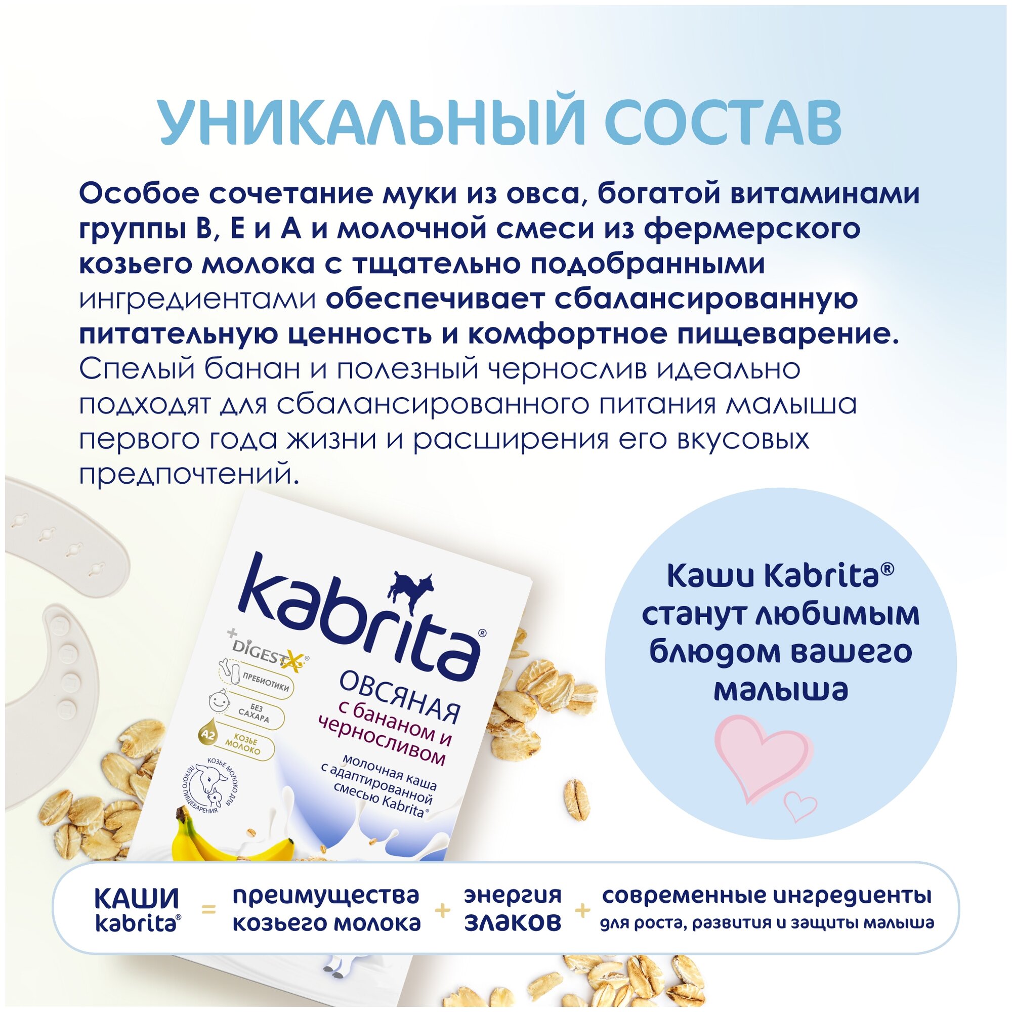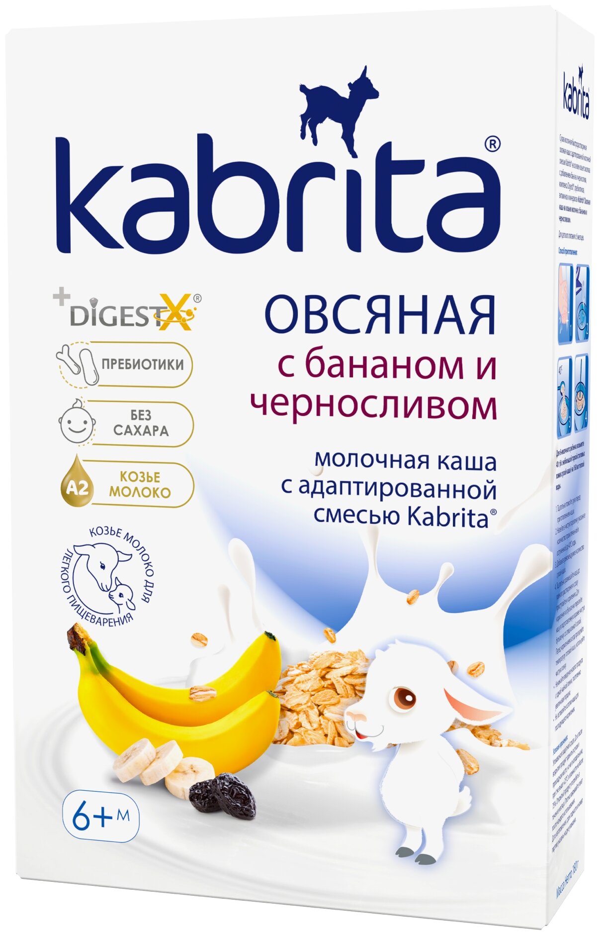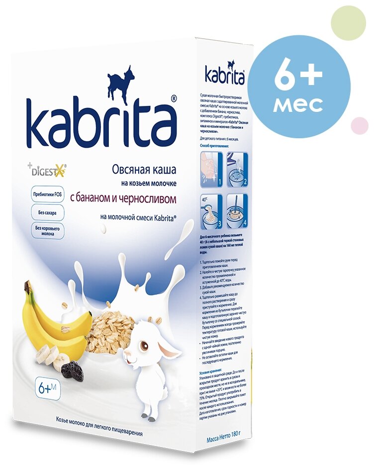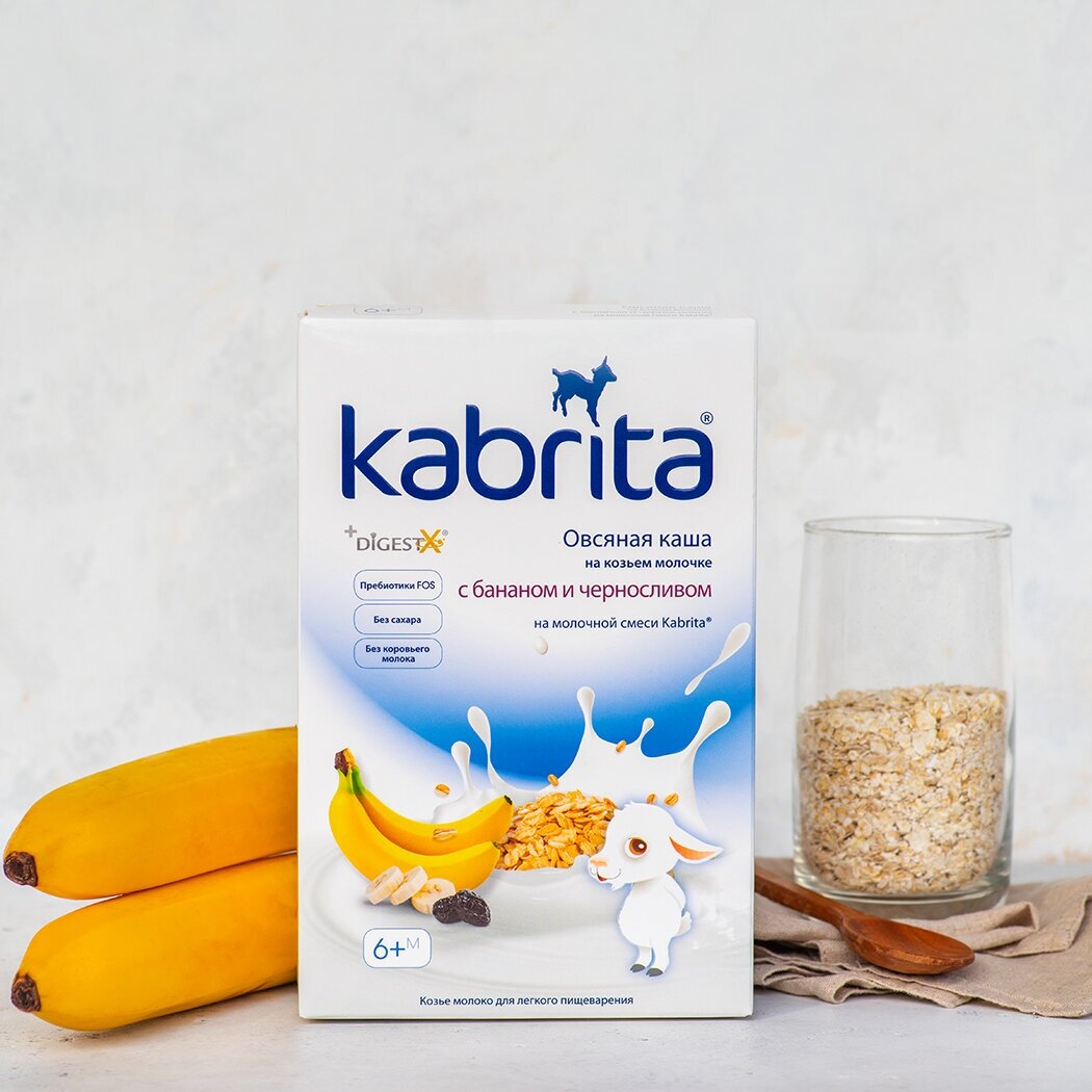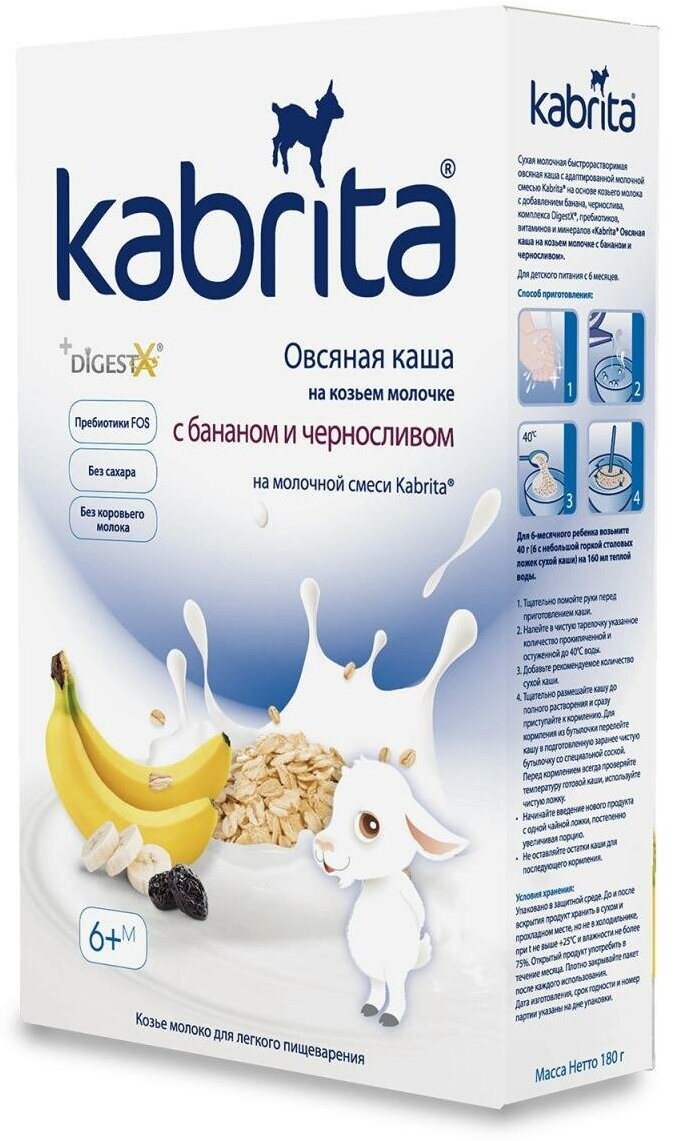 Состав: Мука из овса овес, гидролизованный овес, адаптированная молочная смесь Kabrita на основе натурального козьего молока обезжиренное сухое козье молоко, лактоза, растительные масла пальмовое, рапсовое, подсолнечное масла, комплекс DigestX 1,3-диолеол-2-пальмитоил триглицерид, концентрат сывороточных белков козьего молока, холина хлорид, магния хлорид, L-таурин, соевый лецитин, натуральные банановые хлопья, черносливовые хлопья, фруктоолигосахарид инулин, минеральный премикс карбонат кальция, пирофосфат железа, моногидрат сульфата цинка, йодид калия, витаминный премикс аскорбиновая кислота витамин С, DL-альфа-токоферола ацетат витамин E, ретинола ацетат витамин A, никотинамид витамин Pp, холикальциферол витамин D3, цианокобаламин витамин В12, тиаминмононитрат Витамин B1, фолиевая кислота, пантотенат кальция, пиридоксин гидрохлорид Витамин B6, рибофлавин гидрохлорид Витамин В2.
