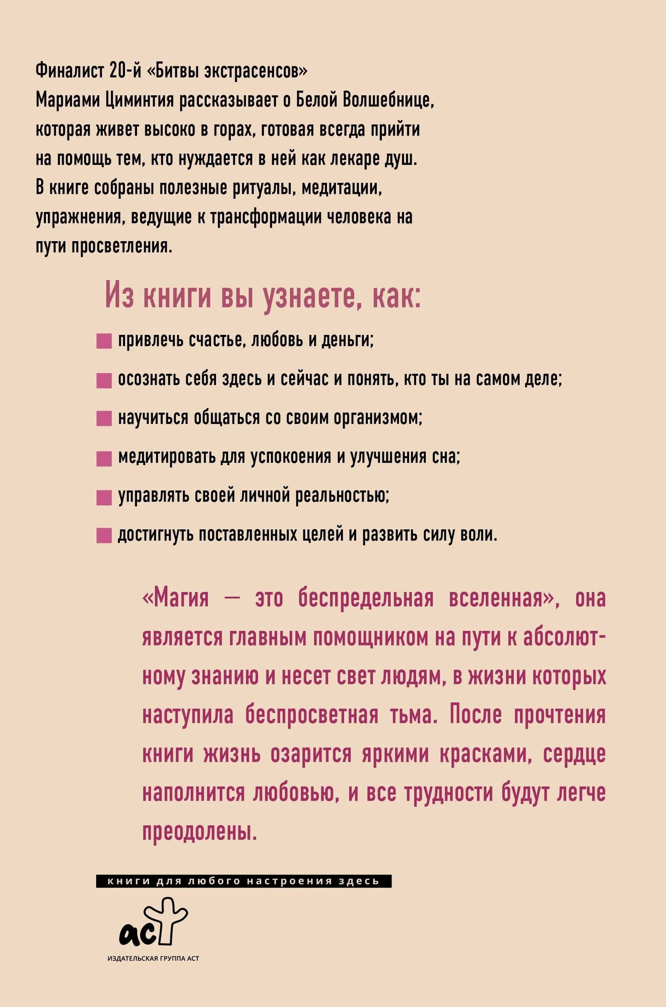 В книге финалист 20-й "Битвы экстрасенсов" Мариами Циминтия рассказывает о Белой Волшебнице, которая живет высоко в горах, готовая всегда прийти на помощь тем, кто нуждается в ней как лекаре душ. В книге собраны полезные ритуалы, медитации, упражнения, ведущие к трансформации человека на пути просветления.