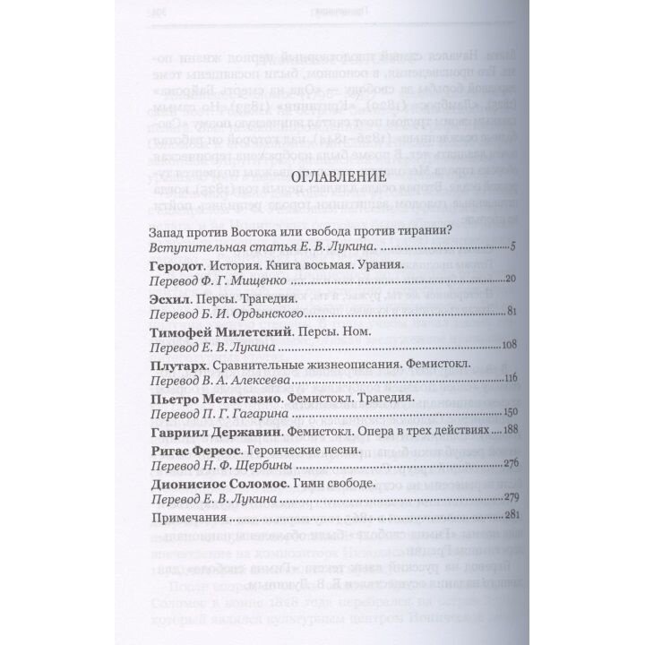 Книга «Запад против Востока. 2500 лет первой битве» посвящена первому масштабному военному конфликту между Западом и Востоком – морскому сражению 28 сентября 480 года до Р.Х. при острове Саламин, где небольшая флотилия древнегреческих кораблей одержала победу над огромным персидским флотом. В книгу вошли фрагменты трудов античных авторов, посвященные этому событию: «История» Геродота (книга восьмая), трагедия Эсхила «Персы», поэма «Персы» Тимофея Милетского, биографический очерк из «Сравнительных жизнеописаний» Плутарха. Книгу дополнили драматические произведения XVIII–XIX веков на эту тему, которые ранее никогда не публиковались: перевод на русский язык трагедии «Фемистокл» итальянского драматурга Пьетро Метастазио и либретто оперы «Фемистокл» поэта Гавриила Державина. Сборник завершили поэтические творения новогреческих авторов: «Героические песни» национального героя Греции Ригаса Фереоса и стихи из поэмы «Гимн свободе» Дионисиоса Соломоса, ставшие национальным гимном современной Греции.