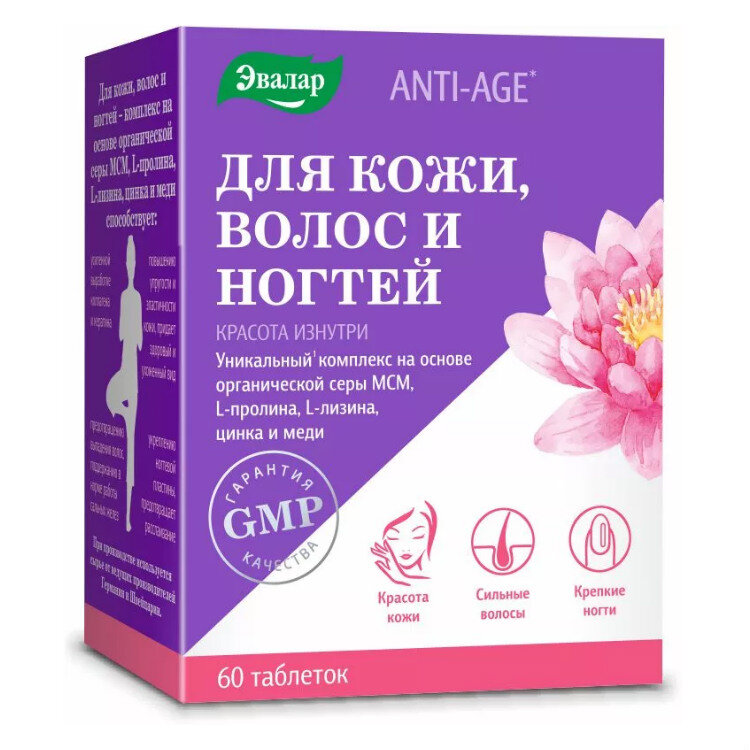 Уникальный комплекс «Для кожи, волос и ногтей» — это ежедневное обеспечение организма ценными питательными и восстанавливающими веществами для поддержания естественной красоты изнутри. Способствует усиленной выработке коллагена и кератина; улучшению состояния кожи, волос и ногтей, anti-age эффекту. Поддерживает красоту кожи, способствует её упругости и эластичности, придает здоровый и ухоженный вид Способствует укреплению ногтевой пластины (предотвращает расслаивание). Делает волосы сильными и блестящими, защищает их от выпадения и излишней жирности