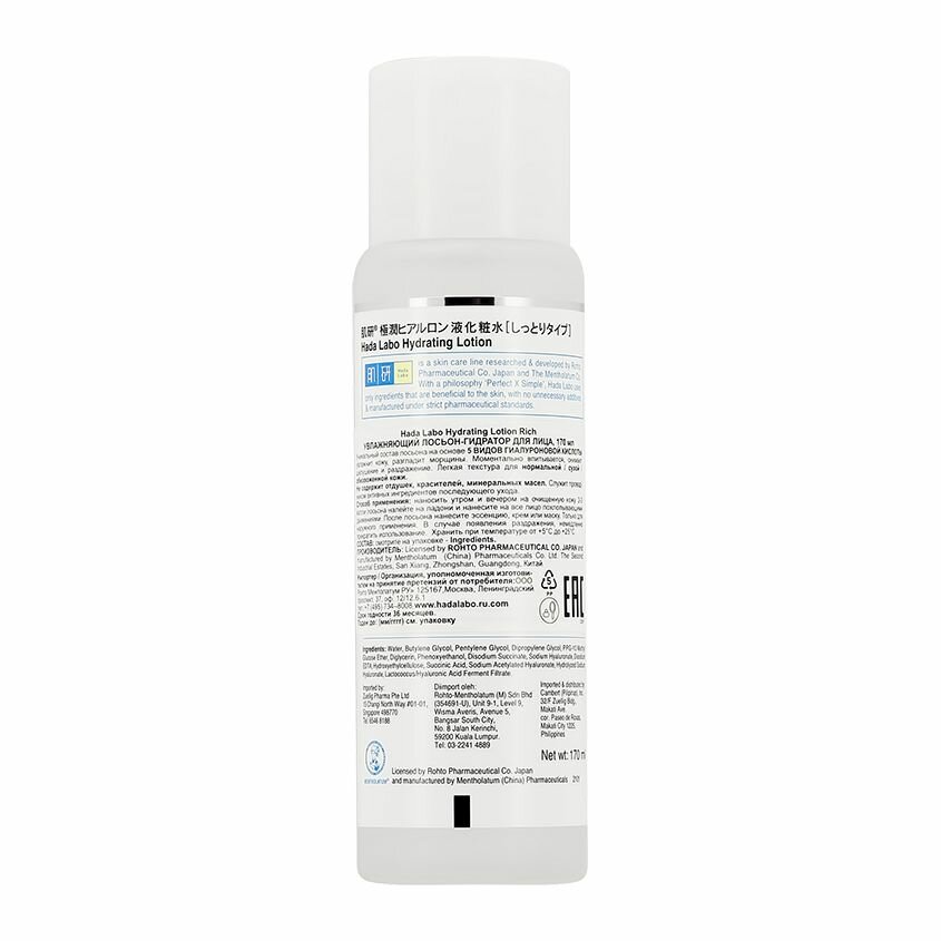 Лосьон содержит три типа гиалуроновой кислоты, что обеспечивает увлажнение в глубоких слоях и защиту от потери влаги с поверхности кожи. Версия для сухой кожи чуть более густая и насыщенная. Увлажняющие японские лосьоны Hada Labo прославились среди российских девушек благодаря превосходным увлажняющим свойствам в сочетании с демократичной ценой. Вполне вероятно, что эта скромная бутылочка окажется лучше, чем батарея люксовых кремов на вашей полке. Прозрачный, без запаха, по консистенции почти как вода, не требует применения ватного диска. Полностью и надолго убирает все покраснения, шелушения, совершенно никакого слоя липкости на лице или засорённых пор просто увлажнённая матовая кожа. Сочетается с любыми средствами ухода после него можно наносить сыворотку, увлажняющую эмульсию или крем. Способ применения: вылить на ладонь количество лосьона примерно около 1 чайной ложки, похлопывающими движениями распределить по лицу. Состав: Вода, DPG, глицерин, гидролизованная гиалуроновая кислота (наногиалуроновая кислота), ацетил гиалуроновая кислота (супер гиалуроновая кислота), гиалуроновая кислота Na, янтарная кислота 2Na, ППГ-20 метил глюкоза, янтарная кислота, метилпарабен. Производитель: Япония.