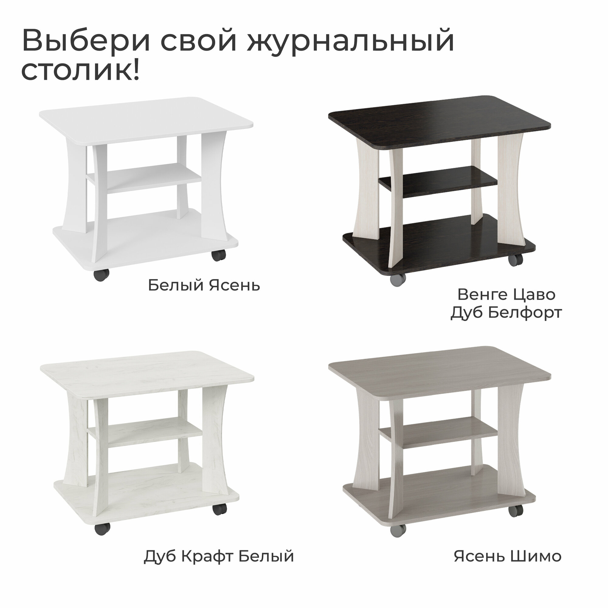 Высокий журнальный столик Тип 8 станет отличным помощником в оформлении зоны отдыха. Модель идеально подойдет для хранения печатной продукции и проведения чаепития.Преимущества:эргономичные колесики - изделие можно использовать в качестве сервировочного столика;удобное хранение - помимо широкой столешницы и полки у основания, конструкция оснащена небольшой полочкой между опорами;лаконичный стиль - дизайн исполнения столика подойдет к различным интерьерам, будь то домашняя гостиная или комната отдыха в офисе. В качестве материала изготовления модели используется ЛДСП. Края обработаны кромкой ПВХ.