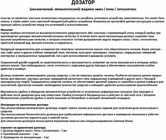 Механический дозатор для пены предназначен для установки в любых санитарно-гигиенических комнатах. Имеет ключ и пластиковый замок. Дозатор прост в эксплуатации, достаточно нажать на кнопку для получения порции средства. Для удобства контроля за уровнем мыла на лицевой поверхности есть смотровое окно в виде капли. Корпус диспенсера изготовлен из прочного пластика АБС чёрного цвета, который выдерживает различные механические воздействия. В резервуар емкостью 1000 мл можно заливать как мыльную пену, так и прочие средства. Разместив диспенсер на стене, достаточно время от времени проверять заполненность резервуара. Иного ухода он не требует, не нуждается в замене батареек. Это отличное решение как для частных владений, так и для гостиниц, кафе, столовых и прочих общественных мест. Габаритные размеры: высота 250 мм, ширина 115 мм, глубина 100 мм. Вес - 0,600 кг.