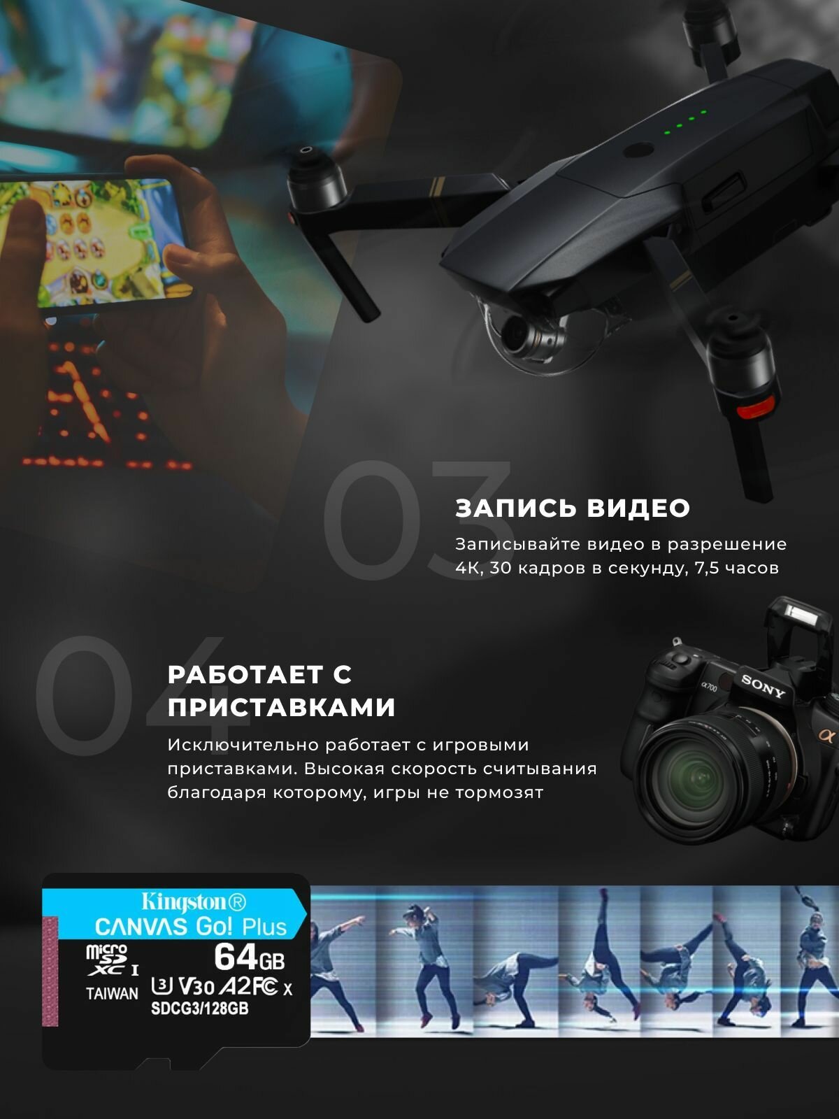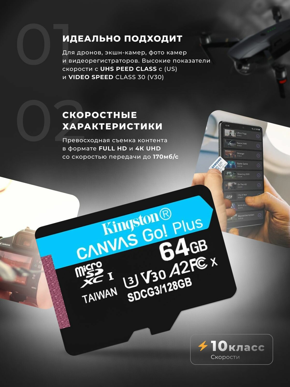Карта памяти microSDXC UHS-I U3 KINGSTON Canvas Go! Plus 64 ГБ 170 МБ/с Class 10 1 шт. переходник SD SDCG3/64GB