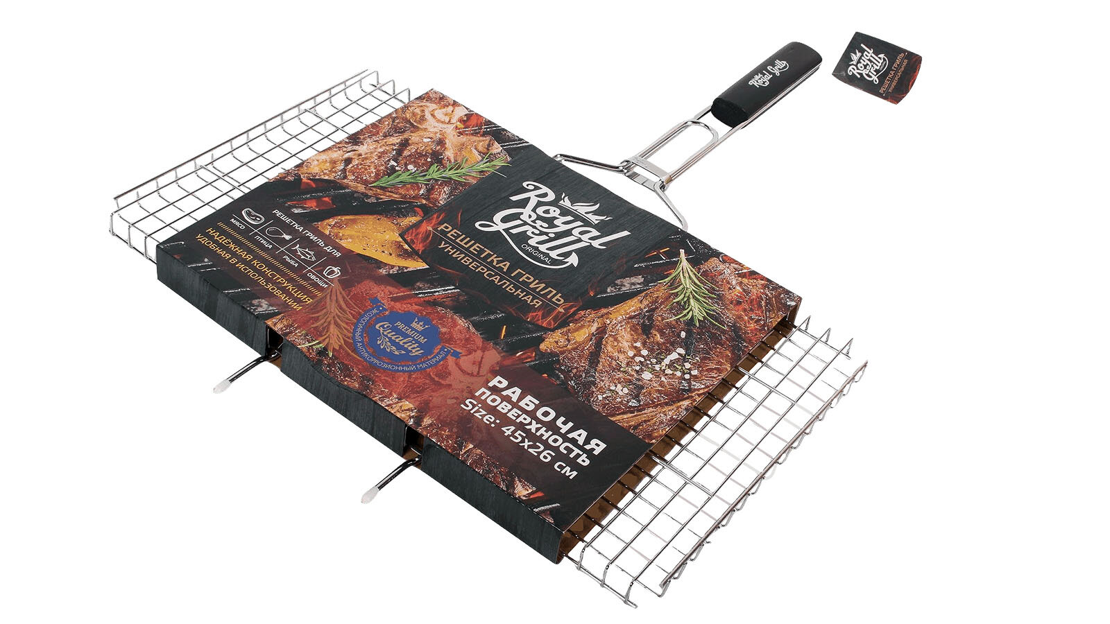 Решетка-гриль большая универсальная 45х26 см ROYALGRILL изготовлена из высококачественной стали с коррозионностойким покрытием. На решетке удобно размещать стейки, ребрышки, гамбургеры, сосиски, рыбу, овощи. Решетка предназначена для приготовления пищи на углях. Блюда получаются сочными, ароматными, с аппетитной специфической корочкой. Рукоятка изделия оснащена деревянной вставкой и фиксирующей скобой, которая зажимает створки решетки.
