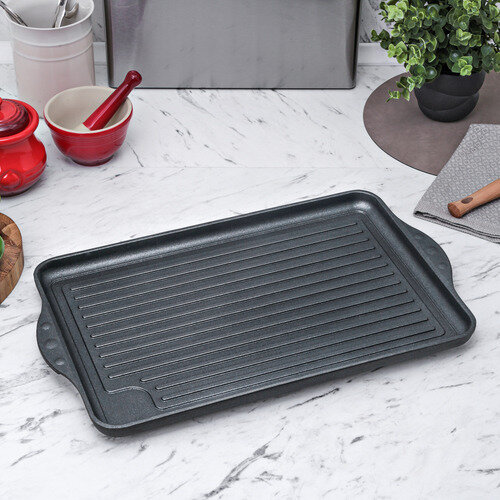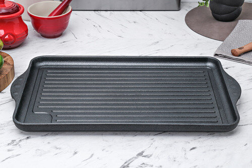 Противень – это посуда премиум класса, изготовленная из высококачественного литого алюминия толщиной 6 мм. Антипригарные качества покрытия позволяют готовить в нем без добавления масла, что положительно сказывается на вкусовых качествах приготовляемых блюд. Противень подходит для приготовления блюд из мяса, рыбы или овощей как на 2 конфорках, так и в духовом шкафу. Рифленая поверхность противня имитирует решетки гриля и образует аппетитную корочку. При этом жир стекает в желобки, не давая продуктам контактировать с ним, что обеспечивает приготовление здоровой пищи.