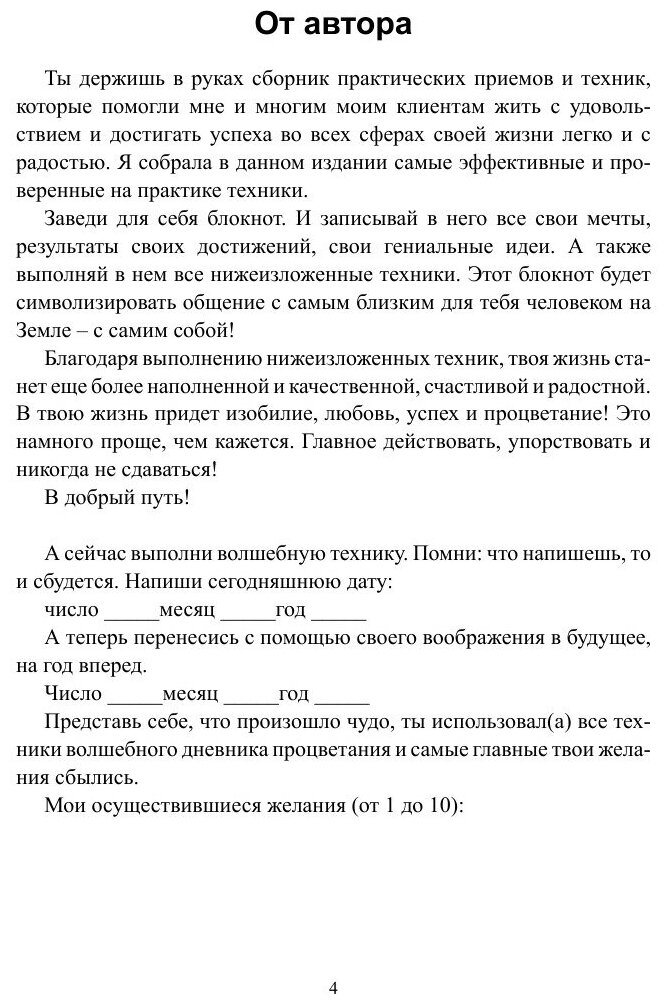 Волшебный дневник процветания – это сборник практических приемов и техник, которые помогли мне и многим моим клиентам жить с удовольствием и достигать успеха во всех сферах своей жизни легко и с радостью. Заведи для себя блокнот. И записывай в него все свои мечты, результаты своих достижений, свои гениальные идеи. А также выполняй в нем все нижеизложенные техники. Этот блокнот будет символизировать общение с самым близким для тебя человеком на Земле – с самим собой! Благодаря выполнению техник, твоя жизнь станет еще более наполненной и качественной, счастливой и радостной. Это намного проще, чем кажется. Главное действовать, упорствовать и никогда не сдаваться!