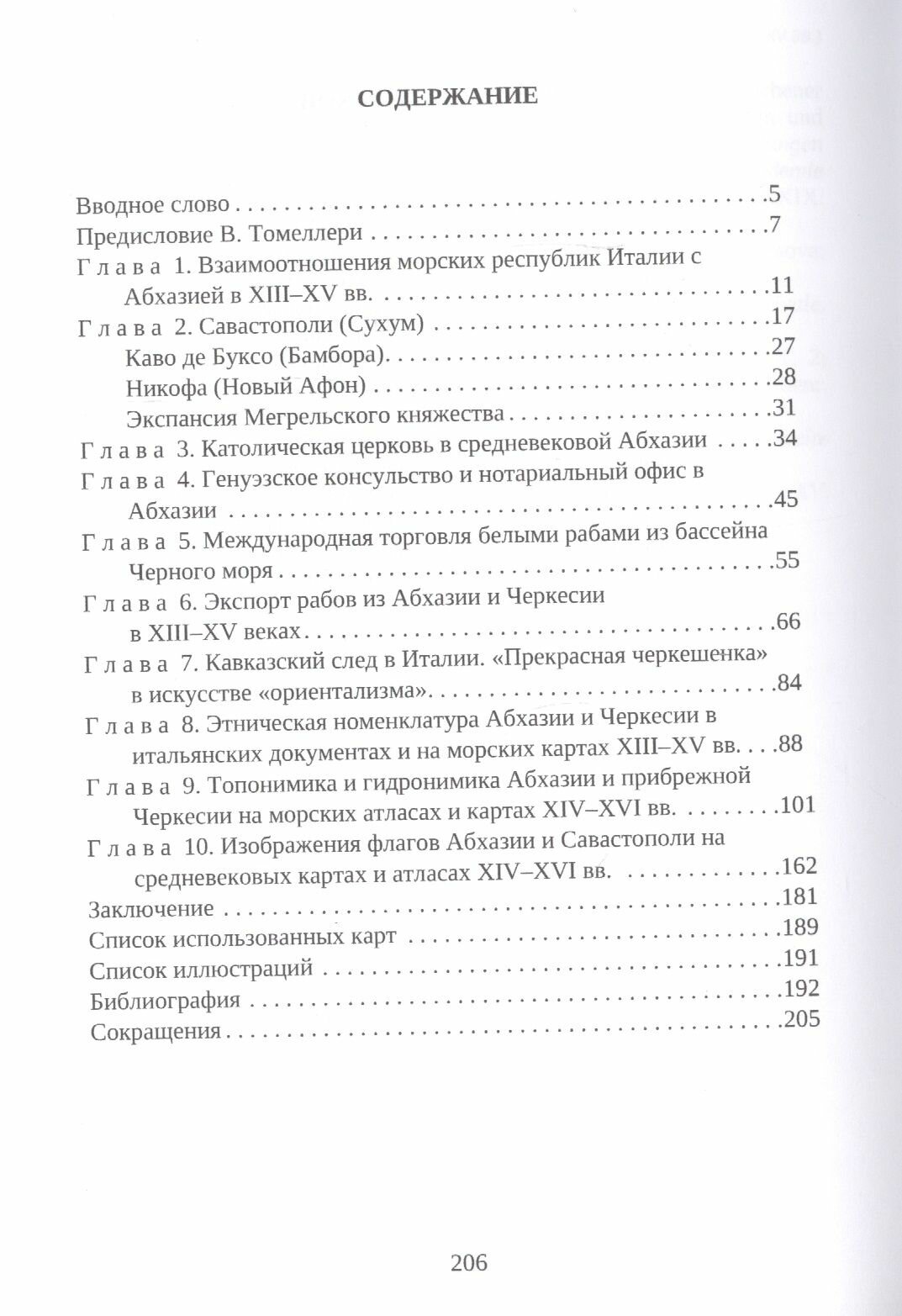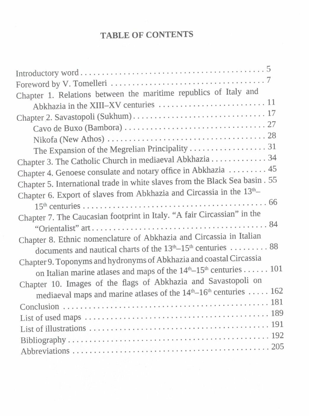 В монографии рассматриваются итало-абхазские взаимоотношения времени динамичной торговой экспансиина черноморском побережье Кавказа итальянских городов-государств, прежде всего Генуи, что является одной из важных и все еще недостаточно изученных тем в области истории средневековой Абхазии (XIII-XV вв). Затрагиваются вопросы, относящиеся к взаимоотношению морских республик Италии с Абхазией в XIII-XV вв., организации торговой деятельности итальянцев в Абхазии, прежде всего, в центральном городе страны — Савастополи (Сухуме), деятельности римско-католической церкви в Абхазии, функционированию консульской и нотариальной службы Генуи в Савастополи, а также к экспорту рабов из бассейна Черного моря, в частности из Абхазии и Черкесии. Анализируются этнонимы, топонимы и гидронимы средневековой Абхазии и причерноморской Черкесии, содержащиеся в различных итальянских документах, на морских картах, атласах и портоланах рассматриваемой эпохи, а также изображенные на средневековых картах флаги Абхазии.
