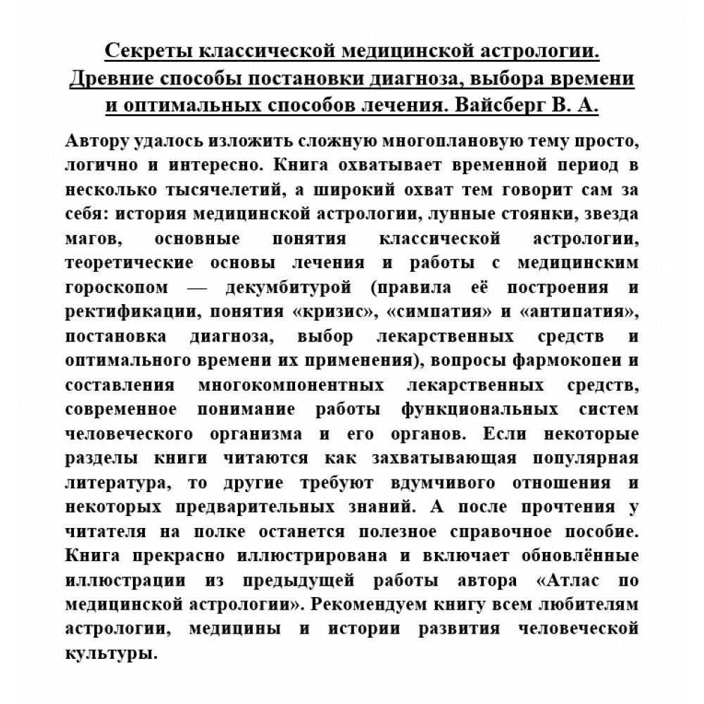 Автору удалось изложить сложную многоплановую тему просто, логично и интересно. Книга охватывает временной период в несколько тысячелетий, а широкий охват тем говорит сам за себя: история медицинской астрологии, лунные стоянки, звезда магов, основные понятия классической астрологии, теоретические основы лечения и работы с медицинским гороскопом — декумбитурой (правила её построения и ректификации, понятия «кризис», «симпатия» и «антипатия», постановка диагноза, выбор лекарственных средств и оптимального времени их применения), вопросы фармокопеи и составления многокомпонентных лекарственных средств, современное понимание работы функциональных систем человеческого организма и его органов. Если некоторые разделы книги читаются как захватывающая популярная литература, то другие требуют вдумчивого отношения и некоторых предварительных знаний. А после прочтения у читателя на полке останется полезное справочное пособие. Книга прекрасно иллюстрирована и включает обновлённые иллюстрации из предыдущей работы автора «Атлас по медицинской астрологии». Рекомендуем книгу всем любителям астрологии, медицины и истории развития человеческой культуры.