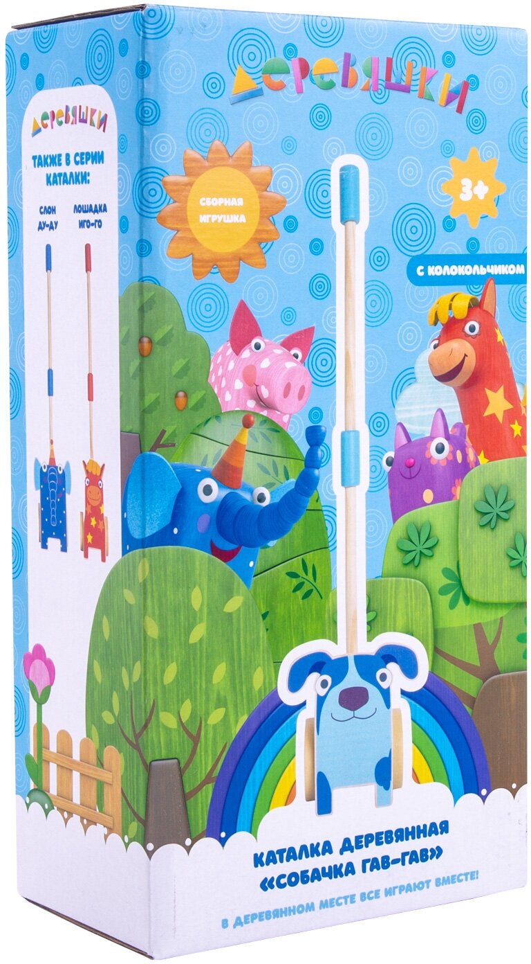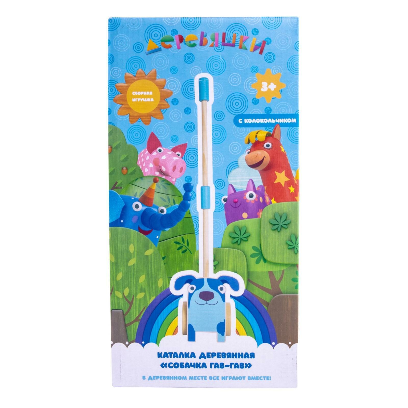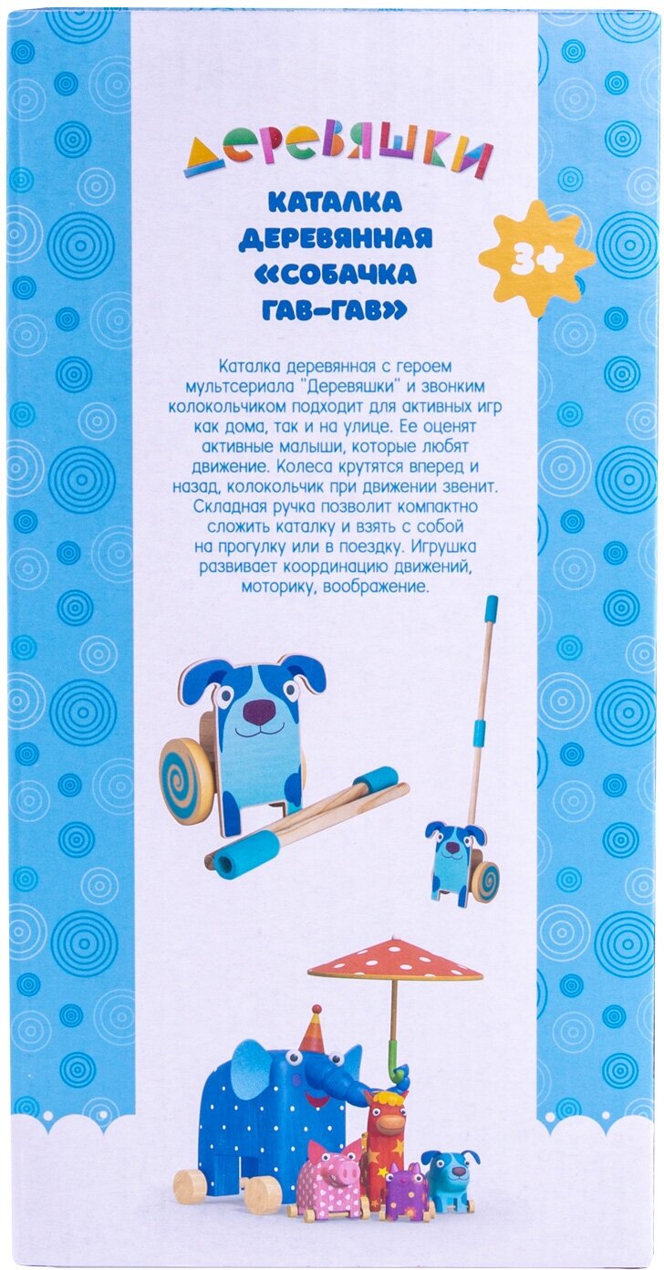 Каталка деревянная с собачкой Гав-Гав из мультсериала Деревяшки и звонким колокольчиком подходит для активных игр как дома, так и на улице. Ее оценят активные малыши, которые любят движение. Колеса крутятся вперед и назад, колокольчик при движении звенит. Складная ручка позволит компактно сложить каталку и взять с собой на прогулку или в поездку. Игрушка развивает координацию движений, моторику, воображение.