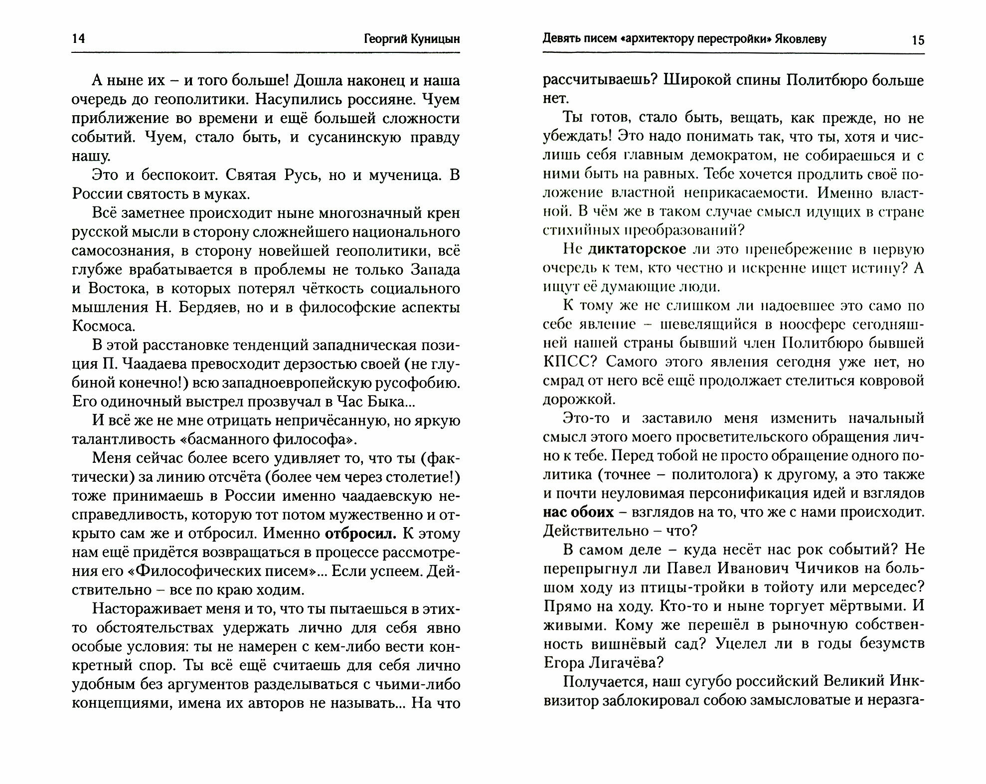 В книге содержатся письма философского характера к А.Н. Яковлеву. Как указывает автор, с "архитектором перестройки" познакомился в Академии общественных наук в 1950-е годы. Затем работал вместе с ним в аппарате ЦК. Куницын изображает себя защитником творческой интеллигенции, в отличие от Яковлева, обвиняет последнего в двоемыслии. При этом в книге чувствуется воспевание собственного Я, что отталкивает читателя от мысли объективного изложения автором ряда событий.