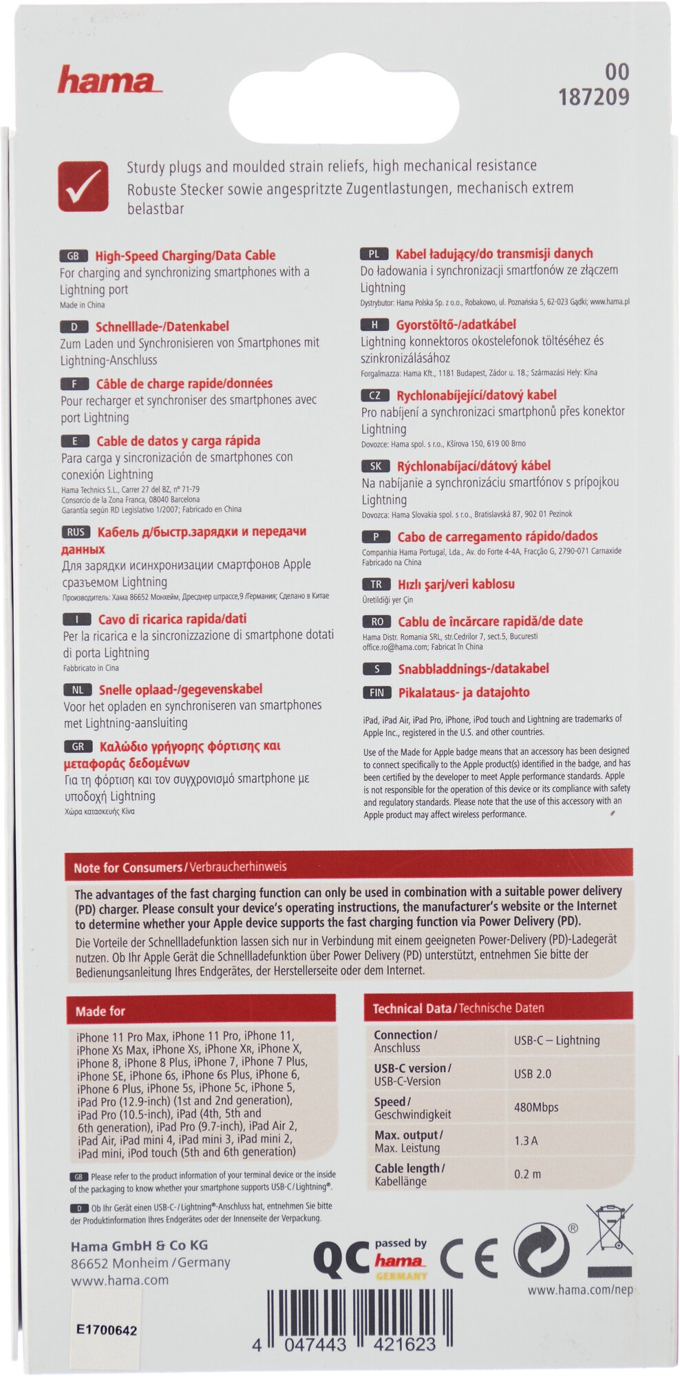 Кабель HAMA USB Type-C (m) Lightning (m) 0.2м MFI белый [00187209]