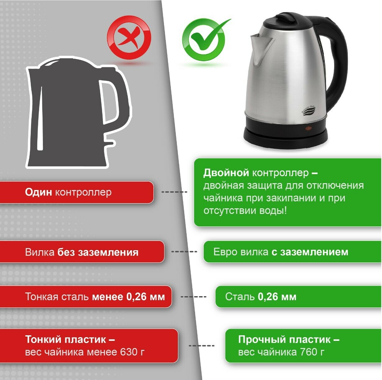 Мощность 1500 Вт. Ёмкость 1,8 литра. Три степени защиты: Двойной контроллер, двойная система защиты для отключения прибора при закипании. Защита от работы без воды. Надежная вилка с заземлением. Корпус из нержавеющей стали. Внутренняя часть крышки из нержавеющей стали. Дисковый нагревательный элемент из нержавеющей стали. Поворот чайника на базе на 360 градусов. Рабочее напряжение 220-240 В. Частота сети питания 50-60 Гц. Класс защиты I.