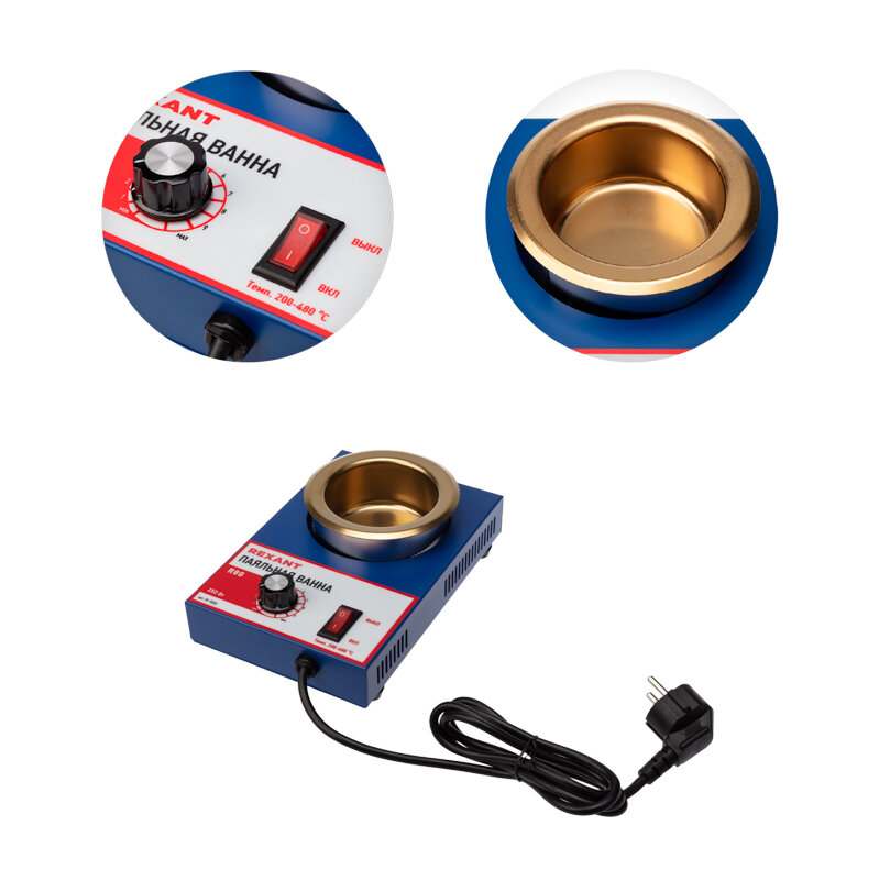 Паяльная ванна применяется для лужения проводников, кабельных наконечников в расплавленном припое. Улучшенное управление температурой, при котором температурный сигнал отсылается на микропроцессор. После обработки сигнал регулирует степень нагрева нагревательного элемента для точности температурного контроля. Обеспечивает нагрев в температурном диапазоне от 200 480 °С, нужная температура достигается за короткое время.