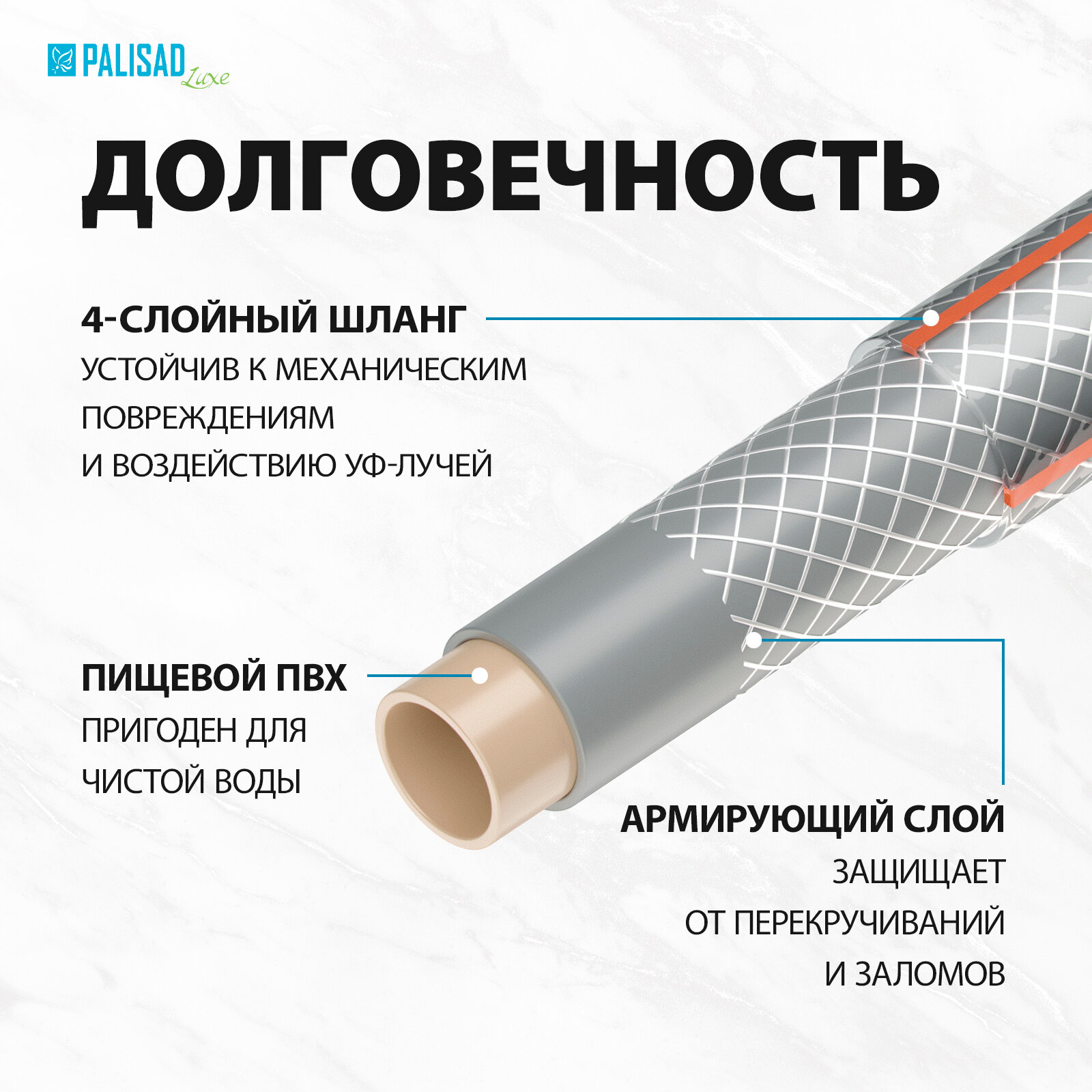 Первый и второй гибкие слои изготовлены из ПВХ повышенного качества в соответствии с международным стандартом ISO 9001, благодаря чему шланг хорошо сохраняет первоначальную форму, не заламывается и не перекручивается.
