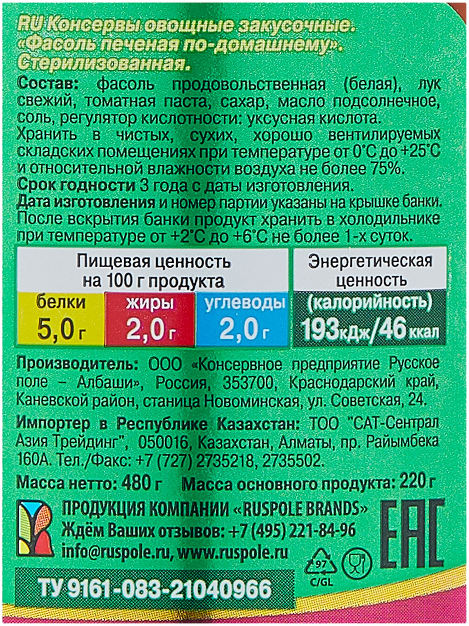 | Состав | фасоль продовольственная (белая), лук свежий, томатная паста, сахар, масло подсолнечное, соль, регулятор кислотности |