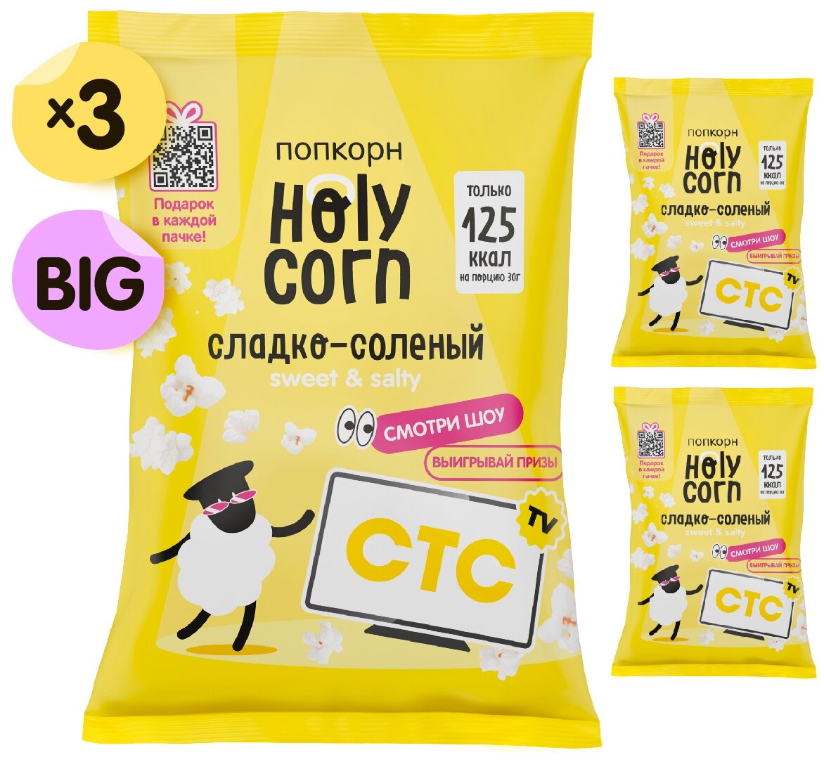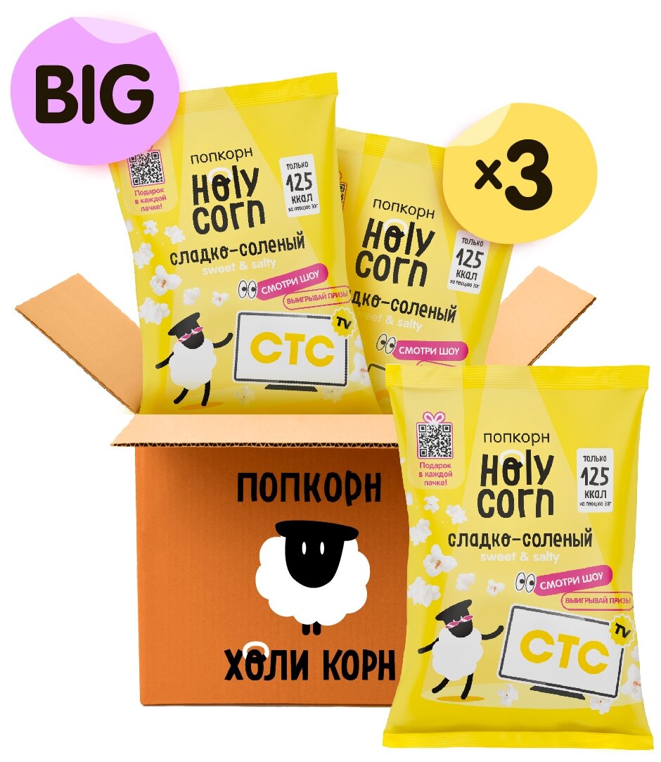 Большая пачка попкорна Holy Corn "Сладко-Соленый" - это идеальный хрустящий снек для веселой вечеринки! Попкорн "Holy Corn" это когда хочется чего-нибудь сладенького....или солененького? Не нужно выбирать! Попкорн готовится из крупных зерен, приправленных щепоткой морской соли и тростниковым сахаром. Внутри вас ждет безупречное сочетание сладкого и соленого вкуса! Классный снек уже готов - скорее открывайте пачку и наслаждайтесь! #холикорни каждый день!