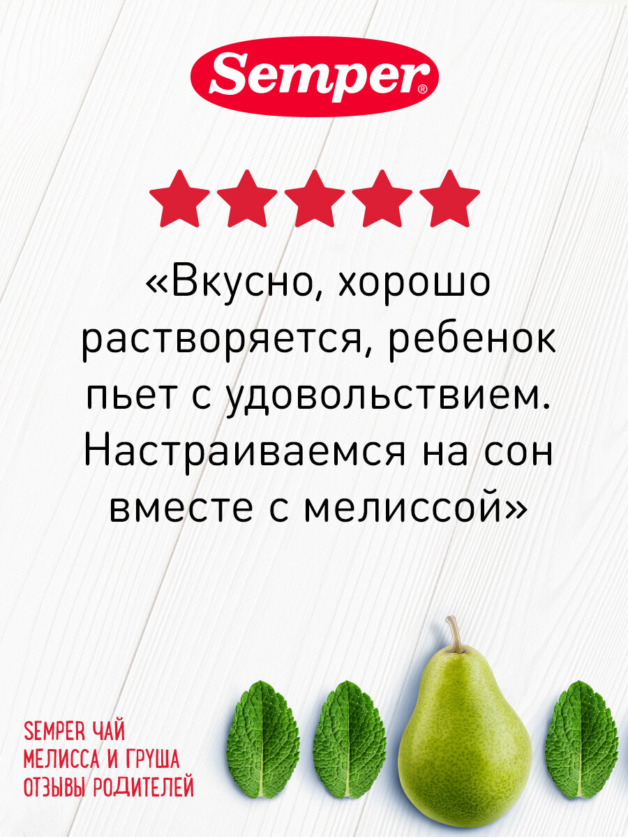 Чай Semper Мята лимонная и груша - это полезная альтернатива сокам! Груша нормализует работу кишечника, лимонная мята мягко успокаивает ребенка, а витамин C повышает устойчивость организма к инфекционным заболеваниям. Чай ароматный, вкусный и не слишком сладкий, быстро и легко растворяется.