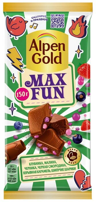 Шоколад Alpen Gold Max Fun Клубника Малина Черника Черная смородина Взрывная карамель и шипучие шарики 150г Mondelez