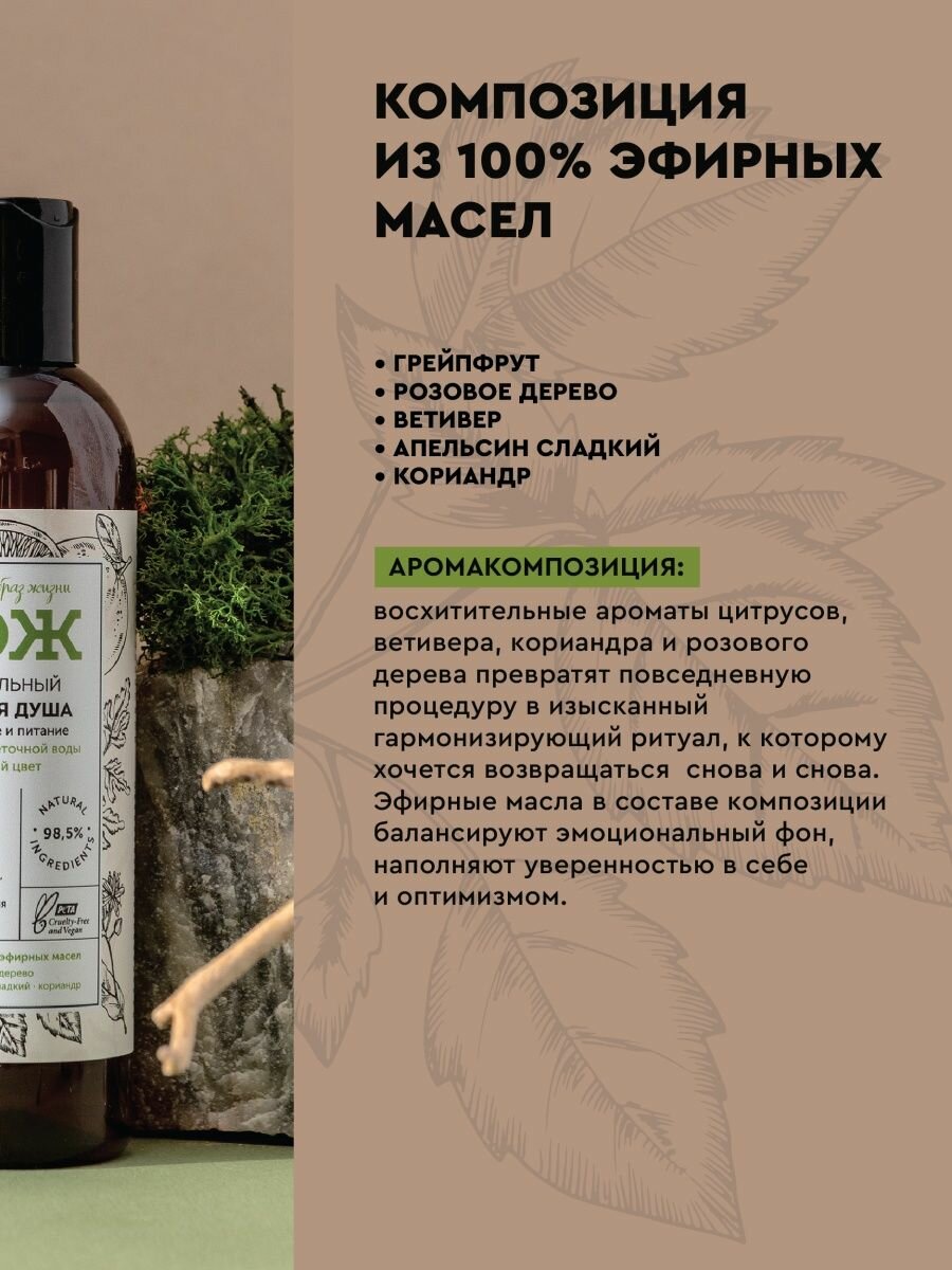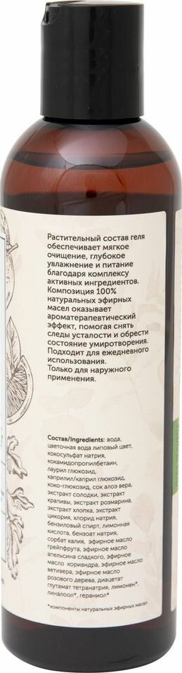 Растительный состав геля обеспечивает мягкое очищение, глубокое увлажнение и питание, благодаря комплексу активных ингредиентов в составе. Композиция 100% натуральных эфирных масел создает атмосферу ароматерапии. Подходит для ежедневного использования. Только для наружного применения.