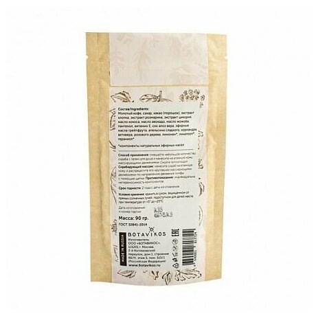 | Состав | молотый кофе; сахар; какао (порошок); экстракт хлопка; экстракт розмарина; экстракт цикория; масло кокоса; масло авокадо; масло жожоба; пантенол; витамин Е; сок алоэ вера; эфирные масла грейпфрута; апельсина сладкого; кориандра; ветивера; розового дерева; лимонен; линалоол; гераниол |