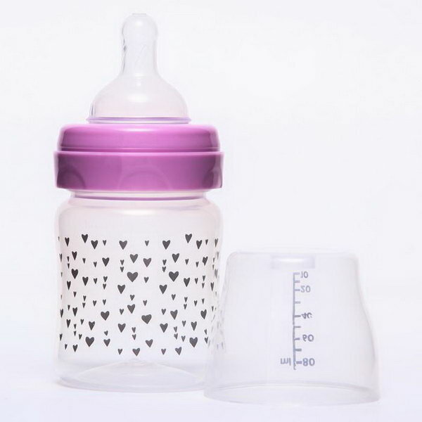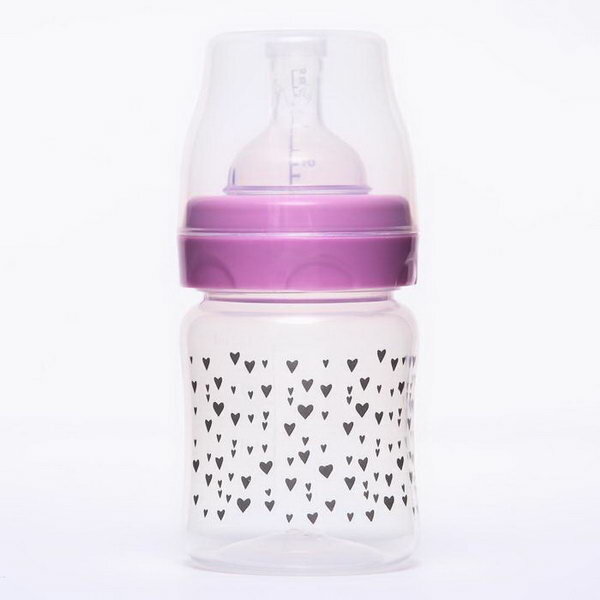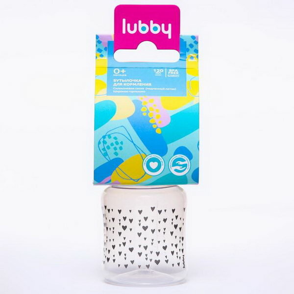 Бутылочка Lubby относится к товарам раннего использования. Украшена узором из серых сердечек.