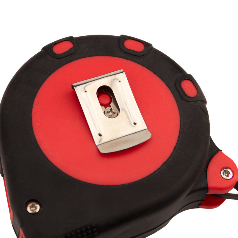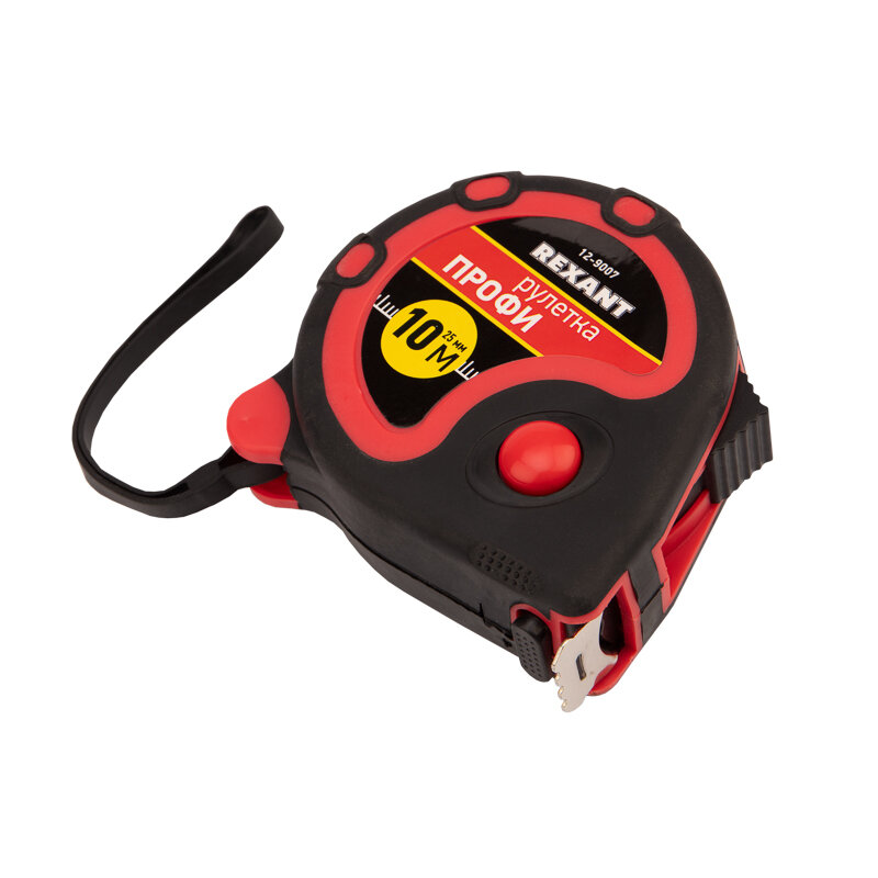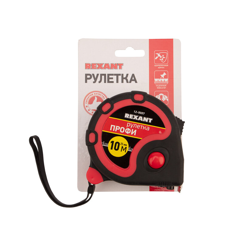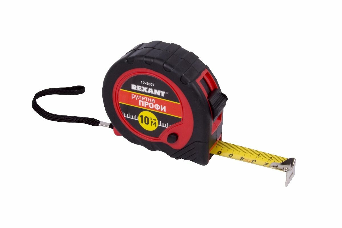 Измерительная рулетка REXANT «Профи» необходима при проведении измерительных работ в строительстве, хозяйстве, ландшафтных и геодезических исследованиях. Эргономичный прорезиненный корпус выполнен из ударопрочного пластика, не скользит в руках. Для удобства использования рулетки предусмотрены кнопки стопора и фиксации тормоза. Полотно обладает удобным зацепом с отверстием посередине. На корпусе расположена клипса-зажим для фиксации рулетки на ремне, кармане или поясной сумке. Ремешок позволяет надевать инструмент на запястье, чтобы освободить руки для работы.