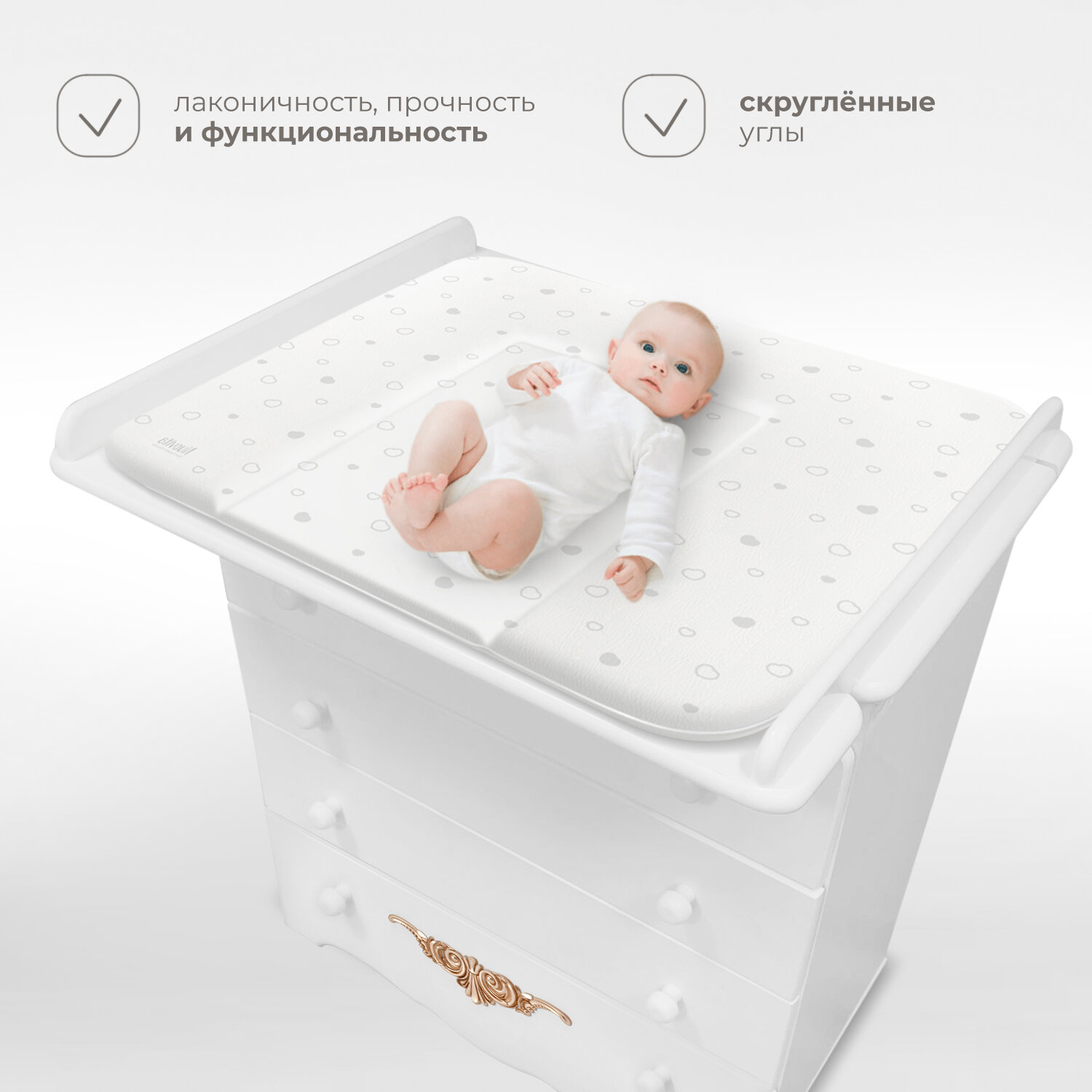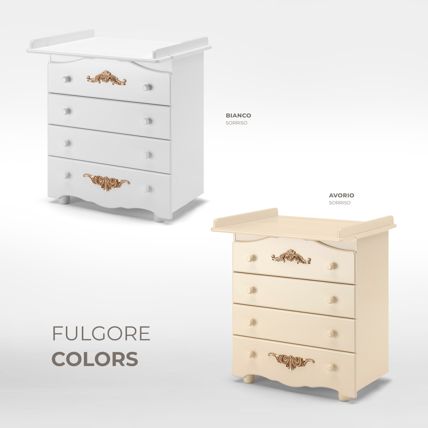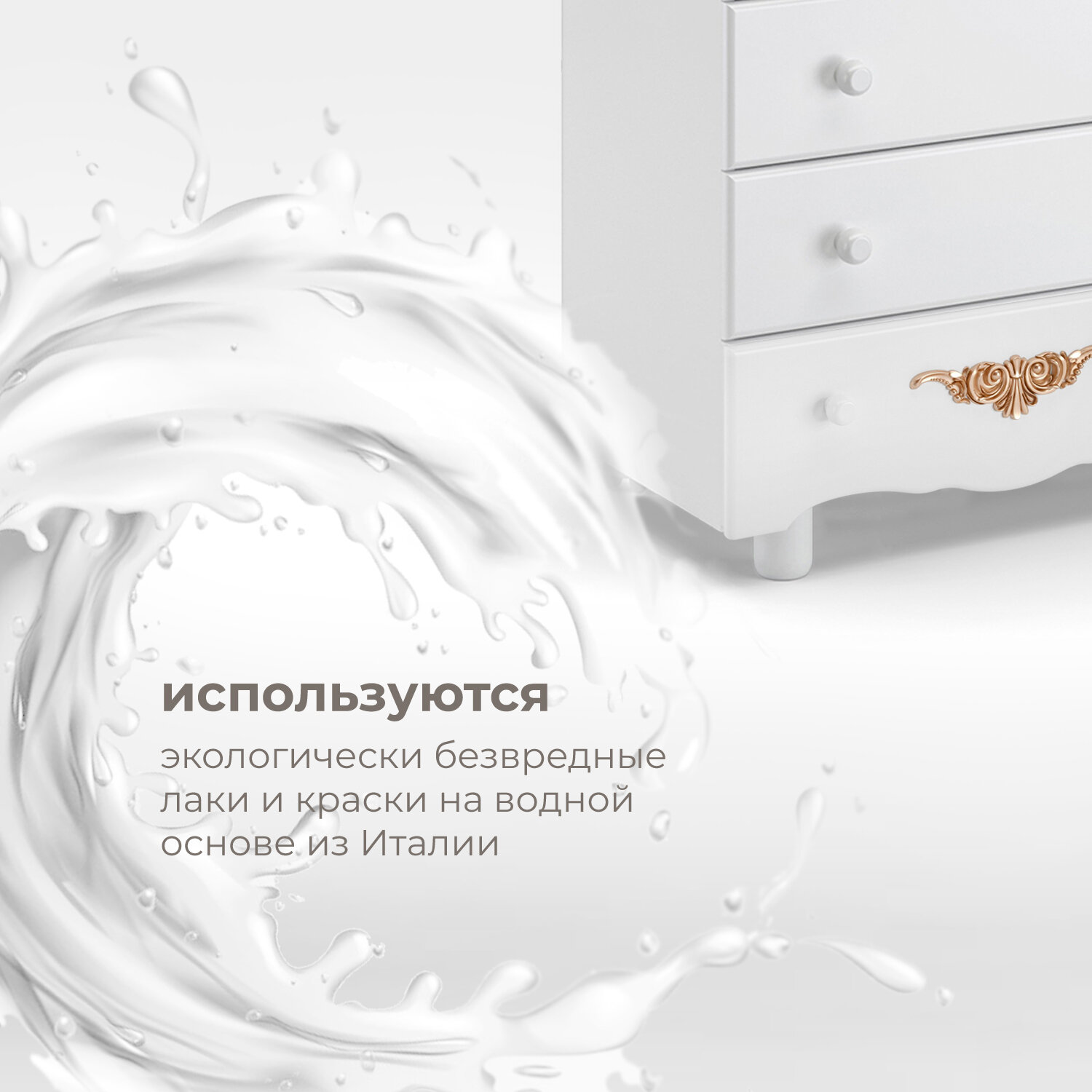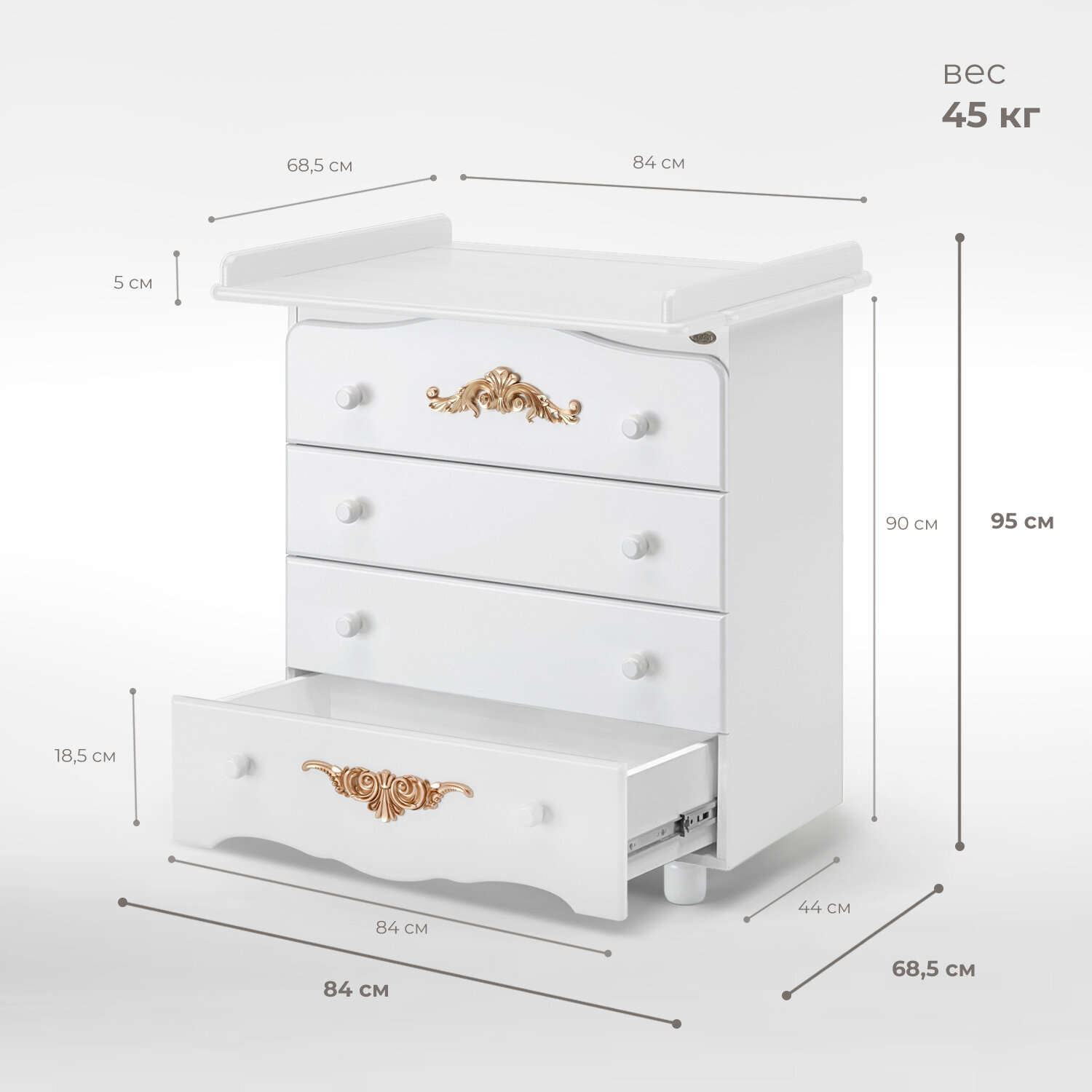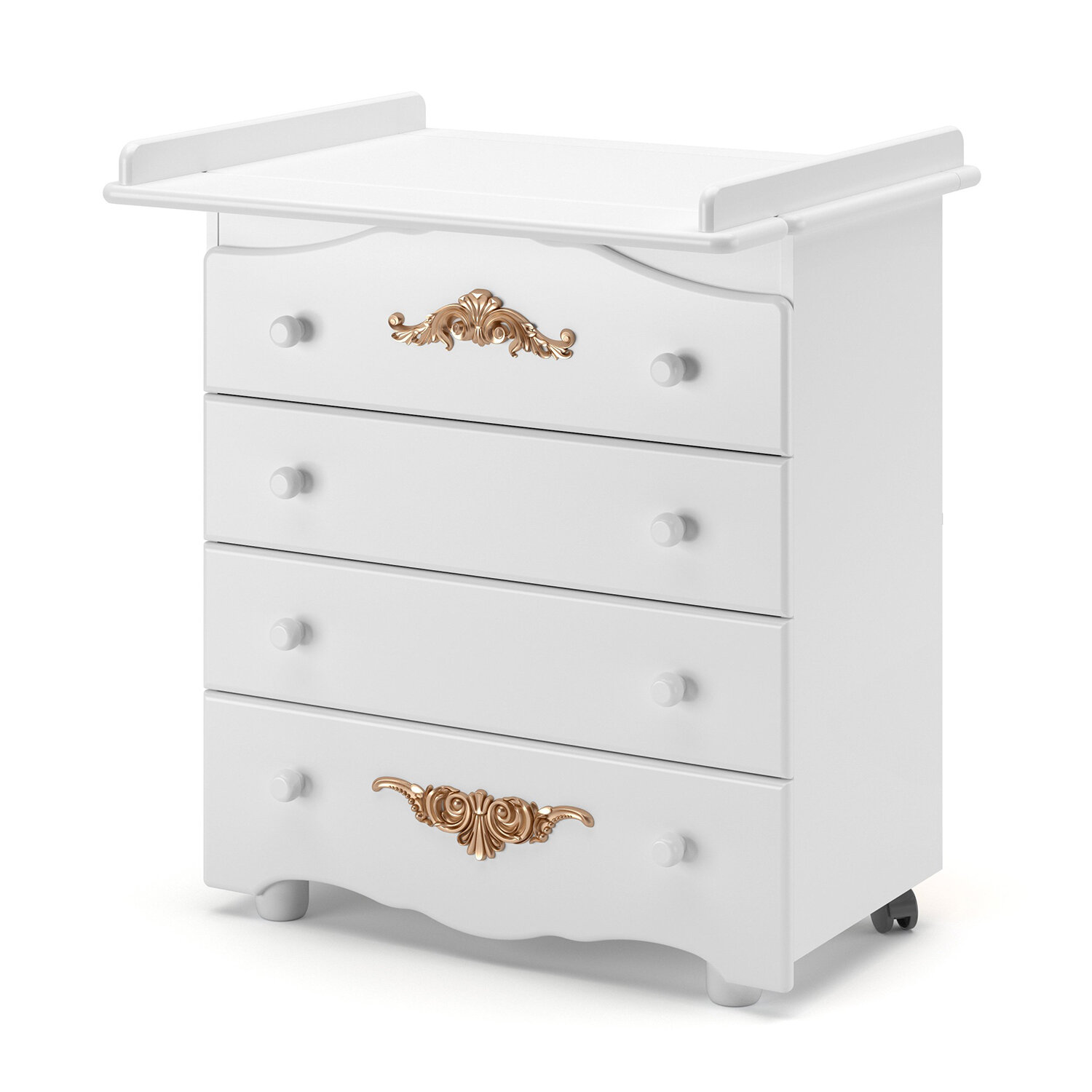 Пеленальный комод NUOVITA FULGORE — компактный и красивый предмет меблировки для детской комнаты.Этот элегантный комод, имеющий практичные размеры (высота 90см, ширина 84 см, глубина 44 см), с легкостью вместит все «приданое» малыша, а впоследствии будет удобен для хранения вещей подросшего ребенка. Пеленальная доска, которая устанавливается на крышке комода, имеет размер 75х68 см, что дает возможность с удобством переодеть младенца и провести гигиенические процедуры. Устойчивые прочные ножки, расположенные спереди, подчеркивают основательность фасада. Колесики, установленные сзади, позволяют при желании без труда передвигать изделие.Основные детали комода изготовлены из натуральной древесины — это массив бука, который является прочным и твердым, что в сочетании с однородной структурой обеспечивает долговечность. Дополнительный плюс — бук отлично впитывает водорастворимые лаки и эмали, используемые маркой NUOVITA при изготовлении детской мебели. Поэтому такое экологичное покрытие хорошо держится на его поверхности, долго сохраняя представительный вид. Именно данные характеристики определили выбор бука в качестве основного материала для комода NUOVITA FULGORE.Второстепенные элементы конструкции (задняя стенка, днища ящиков) сделаны из ХДФ-плиты. При небольшой толщине этот современный материал является очень прочным и выдерживает значительные нагрузки. Дополнительное преимущество ХДФ — он изготавливается из древесного волокна без применения клея, что позволяет говорить об экологичности состава. Применяемая для некоторых деталей ЛДСП изготовлена с герметично закрытыми кромками и соответствует строгому российскому стандарту.Комод NUOVITA FULGORE отличает запоминающийся дизайн: скругленные линии подчеркиваются золоченными молдингами с растительным орнаментом. Накладные элементы, которые очень выразительны, в сочетании с фигурным фасадом и нежными оттенками эмали придают комоду роскошный вид.Продуманная конструкция, применение качественных материалов и современных технологий в изготовлении мебели обеспечивает длительный срок использования комода, в то время как изысканный итальянский дизайн позволяет модели NUOVITA FULGORE стать настоящим украшением интерьера.