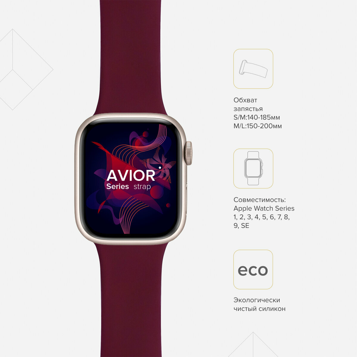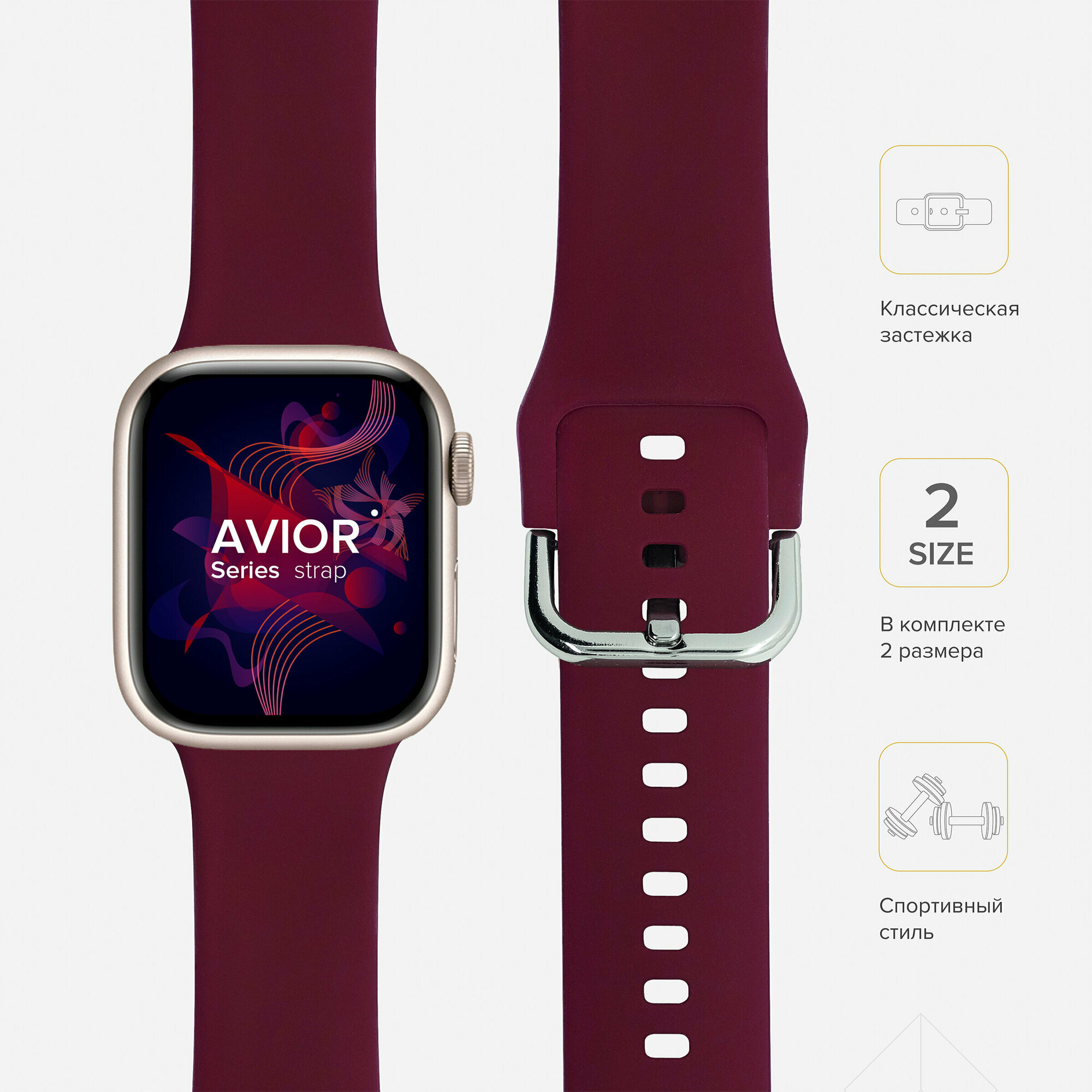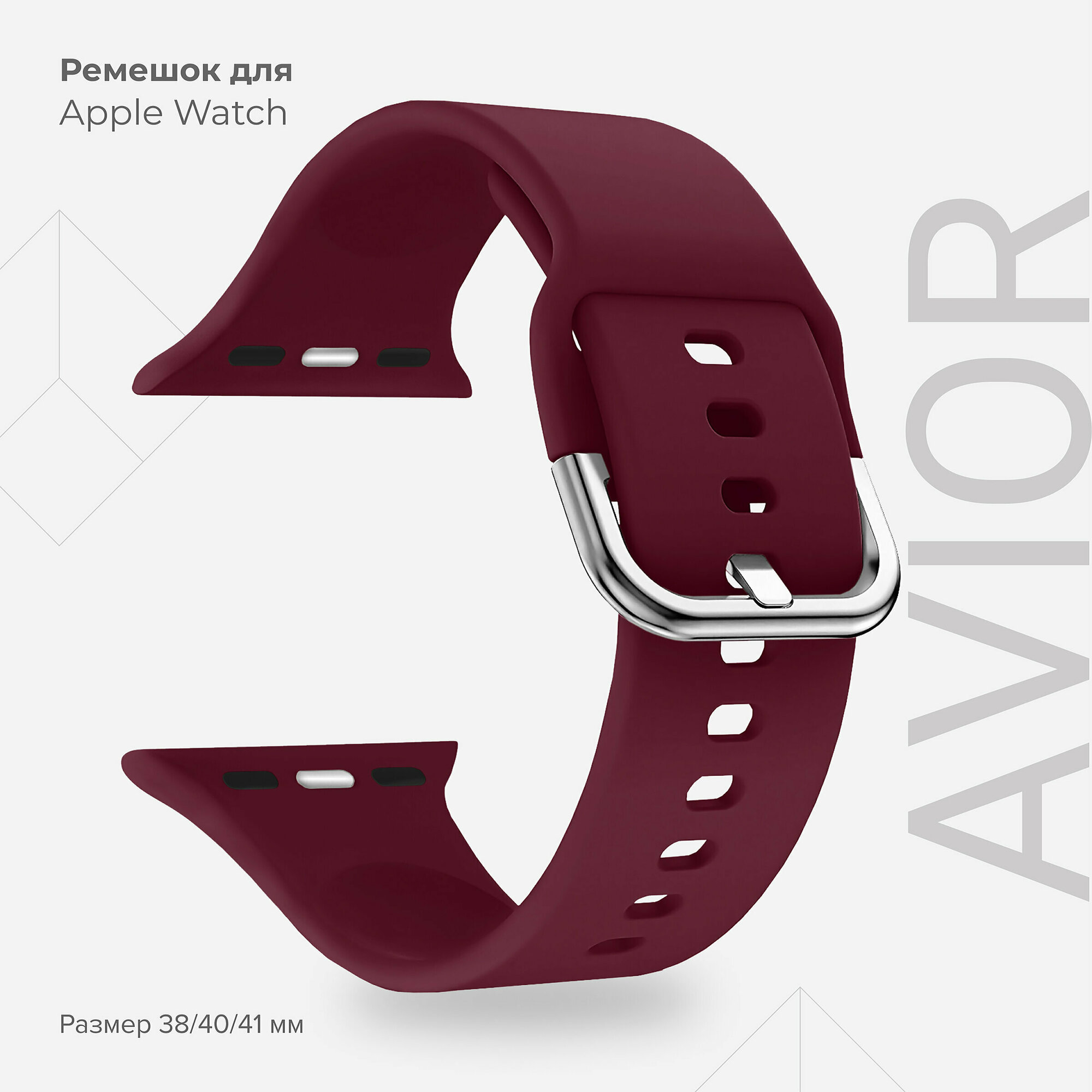 | Прочие особенности | Спортивный ремешок серии AVIOR изготовлен из специального силикона повышенной прочности. , , Данный тип силикона применяется в пищевой промышленности, обладает всеми свойствами этого качественного материала, и не вызывает аллергии., , Ремешок из такого материала комфортно сидит на руке, силикон плотный, гладкий и приятный на ощупь. Классическая застёжка из нержавеющей стали надёжно фиксирует ремешок на запястье., , Размер: 38mm - 40mm, Подходит для Apple watch серии 1, 2, 3, 4, 5 |