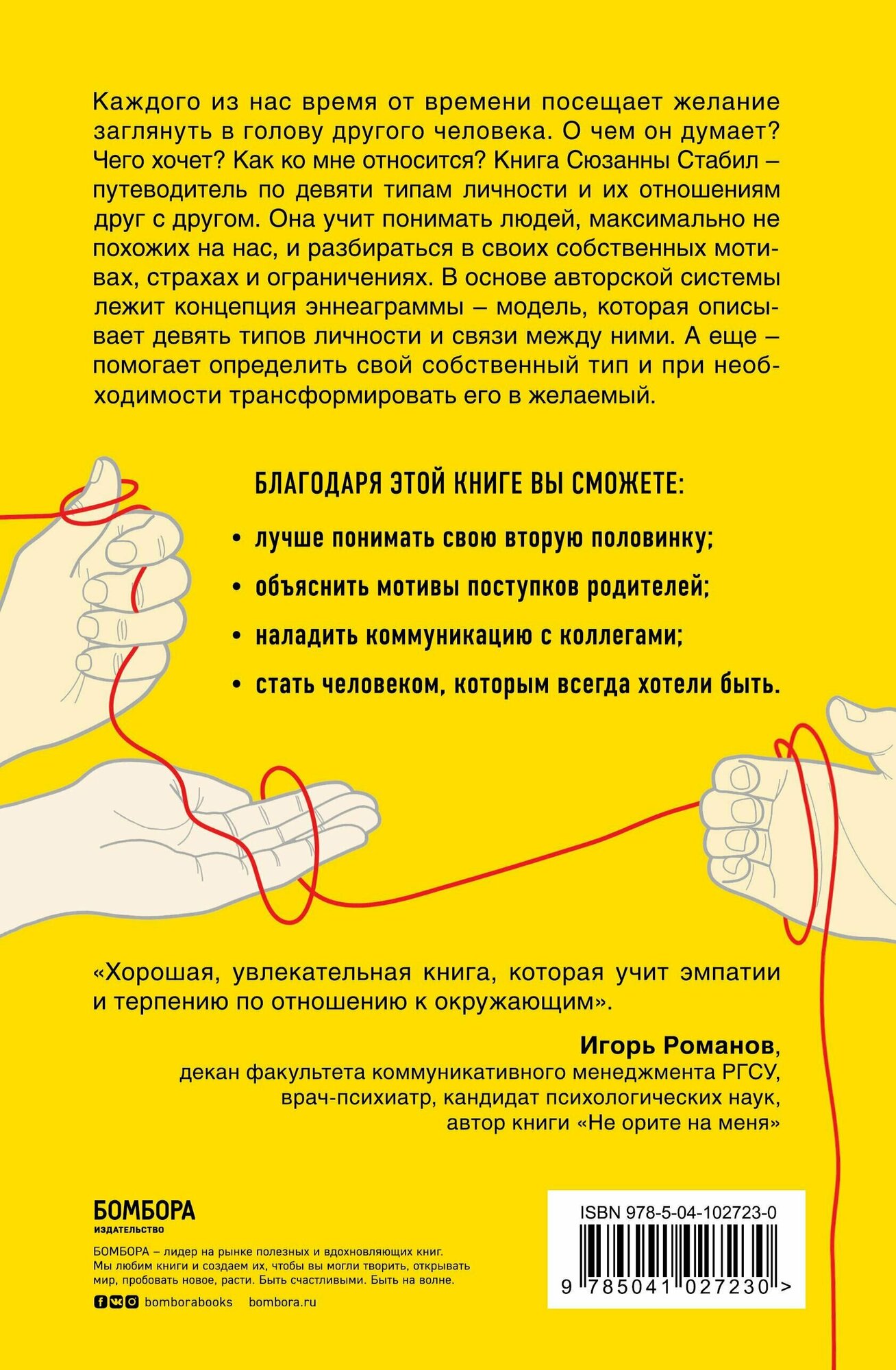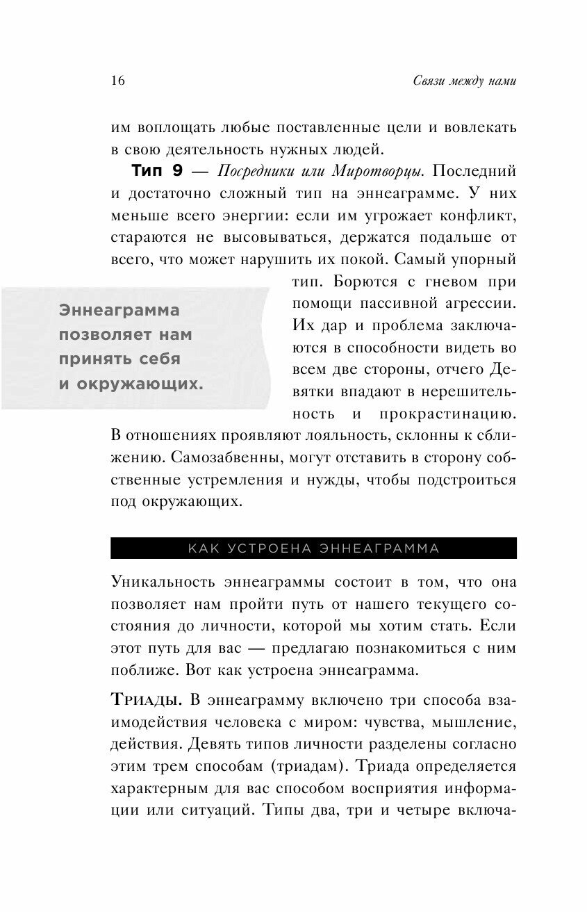 Каждого из нас время от времени посещает желание заглянуть в голову другого человека. О чем он думает? Чего хочет? Как ко мне относится? Книга Сюзанны Стабл - путеводитель по девяти типам личностям и их отношениям друг с другом. Она учит понимать людей, максимально не похожих на нас, и разбираться в своих собственных мотивах, страхах и ограничениях. В основе авторской системы лежит концепция эннеаграммы - модель, которая описывает девять типов личностей и связи между ними. А еще - помогает определить свой собственный тип и при необходимости трансформировать его в желаемый.