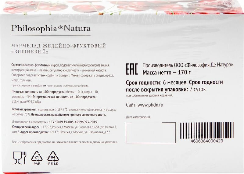 Сервис сравнения цен СкидкаГИД предлагает сравнить цены на товар «Мармелад Philosophia de Natura желейный с вишней 170г»