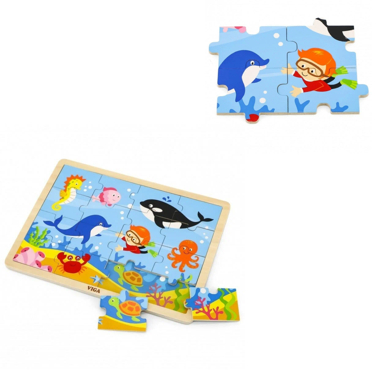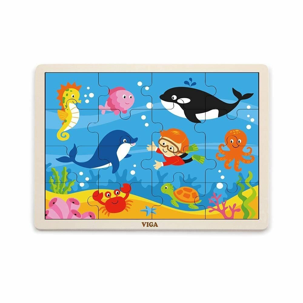 Деревянный пазл Viga Toys Океан состоит из 16 элементов. Красочный и простой: его легко соберут малыши от 2 лет. Идеально сочетается с методикой Марии Монтессори - не перегружая ребенка, дает ему отличный материал для развития.В центре картинки ярко-синее дно моря и маленький ныряльщик, который прекрасно себя чувствует на морской глубине. Он изучает яркий подводный мир и его обитателей - дельфина, кита, рыбку, краба, осьминога, морского конька.Развивающий пазл Viga Toys Океан - позволяет собирать цельную картинку и морских жителей по отдельности. Во время занятия ребенок задействует разные виды мышления, тренирует зрительно-моторную координацию, учится находить связь между частями и целым. Складывая столь интересное тематическое изображение, малыш узнает много нового о подводном мире, расширяет словарный запас и кругозор.Деревянный пазл Океан развивает ребенка и помогает исполнить заветную мечту всех родителей - занять малыша полезным делом и освободить чуть больше времени для себя. Этот деревянный развивающий пазл Viga Toys экологичен, соответствует EN71 и ASTM стандартам качества и безопасности детских игрушек