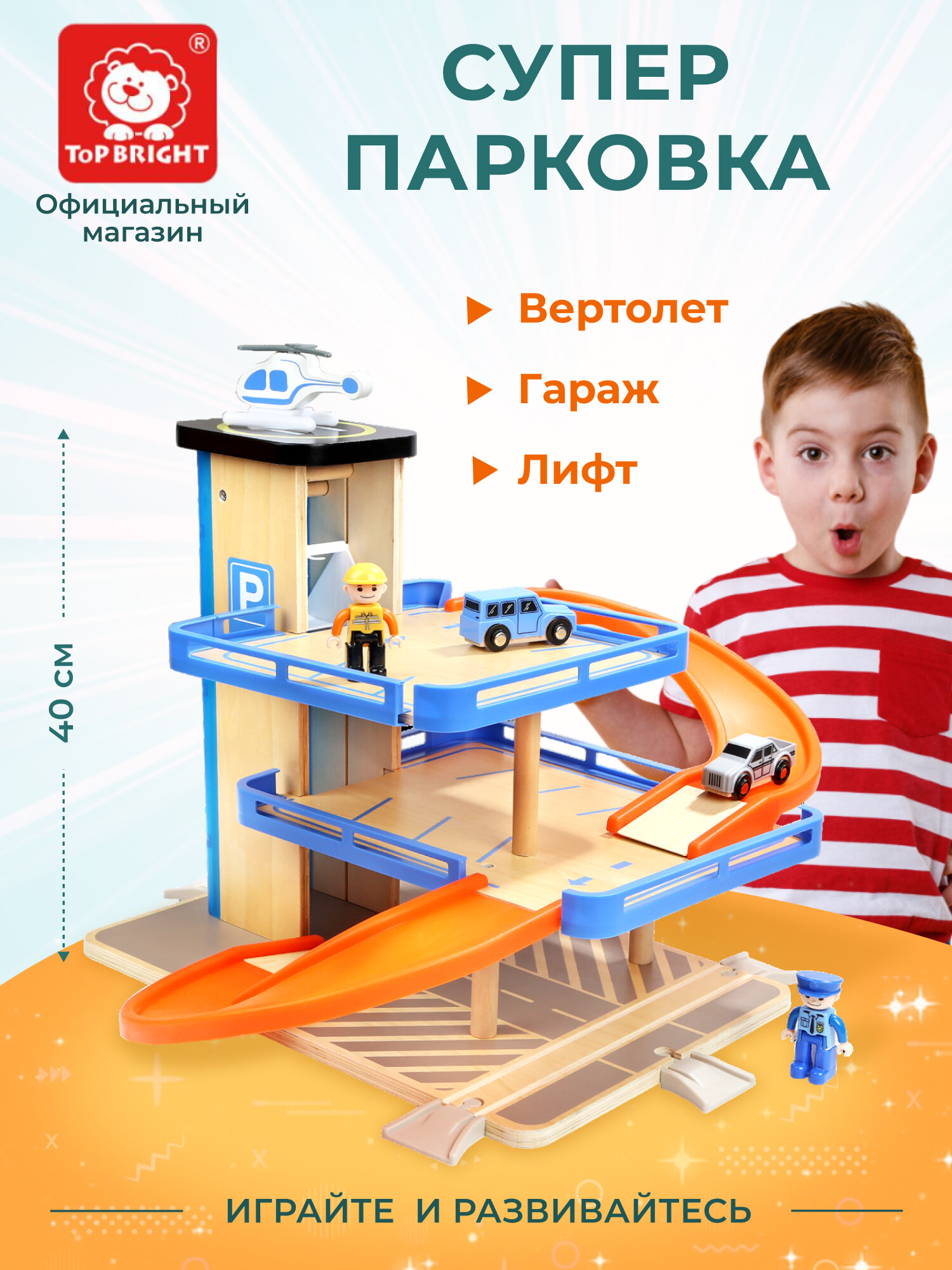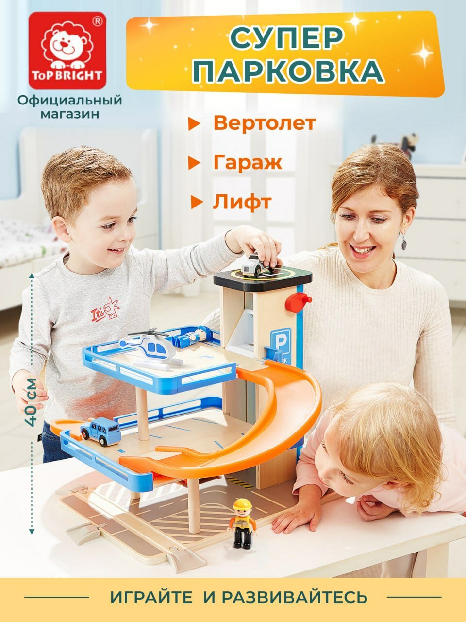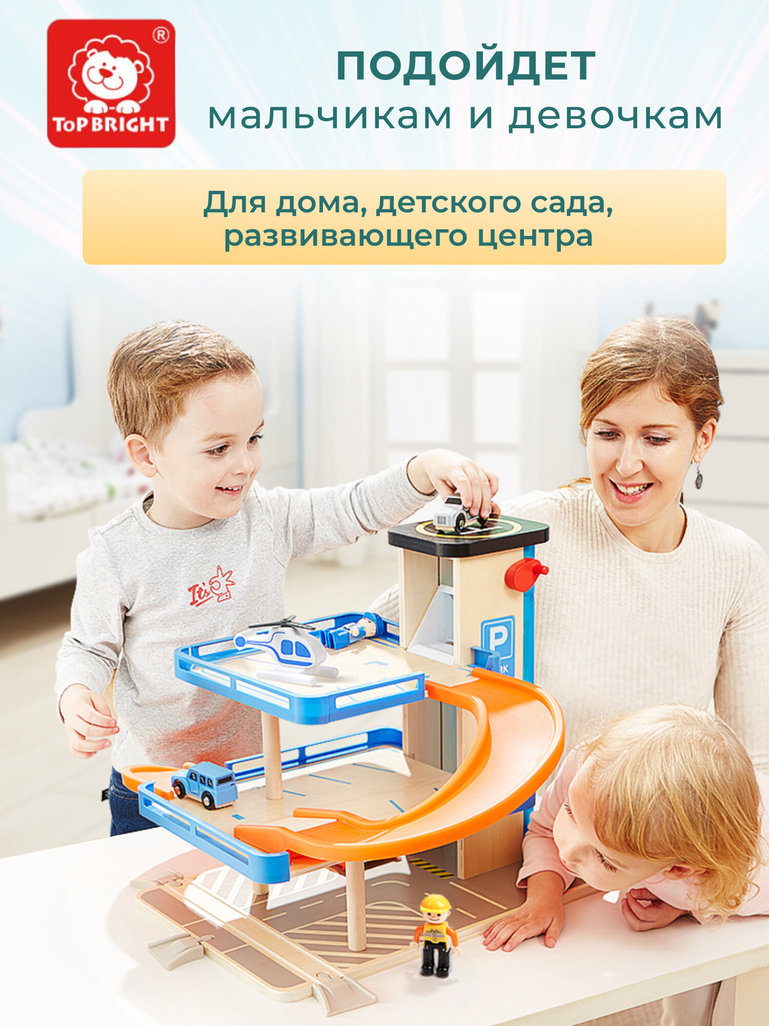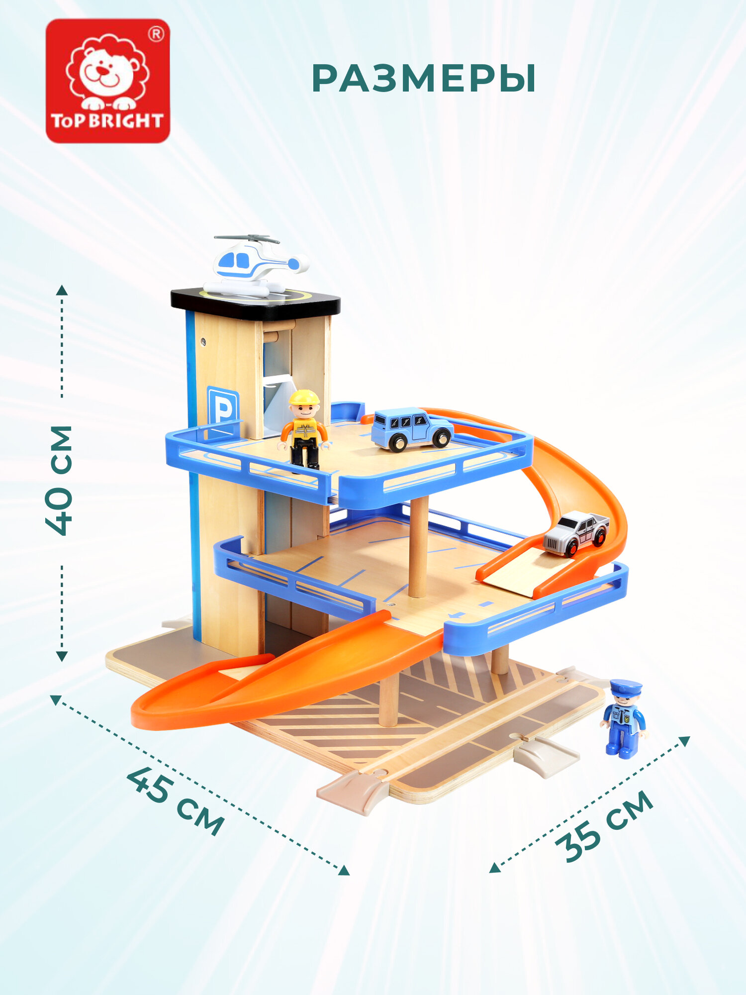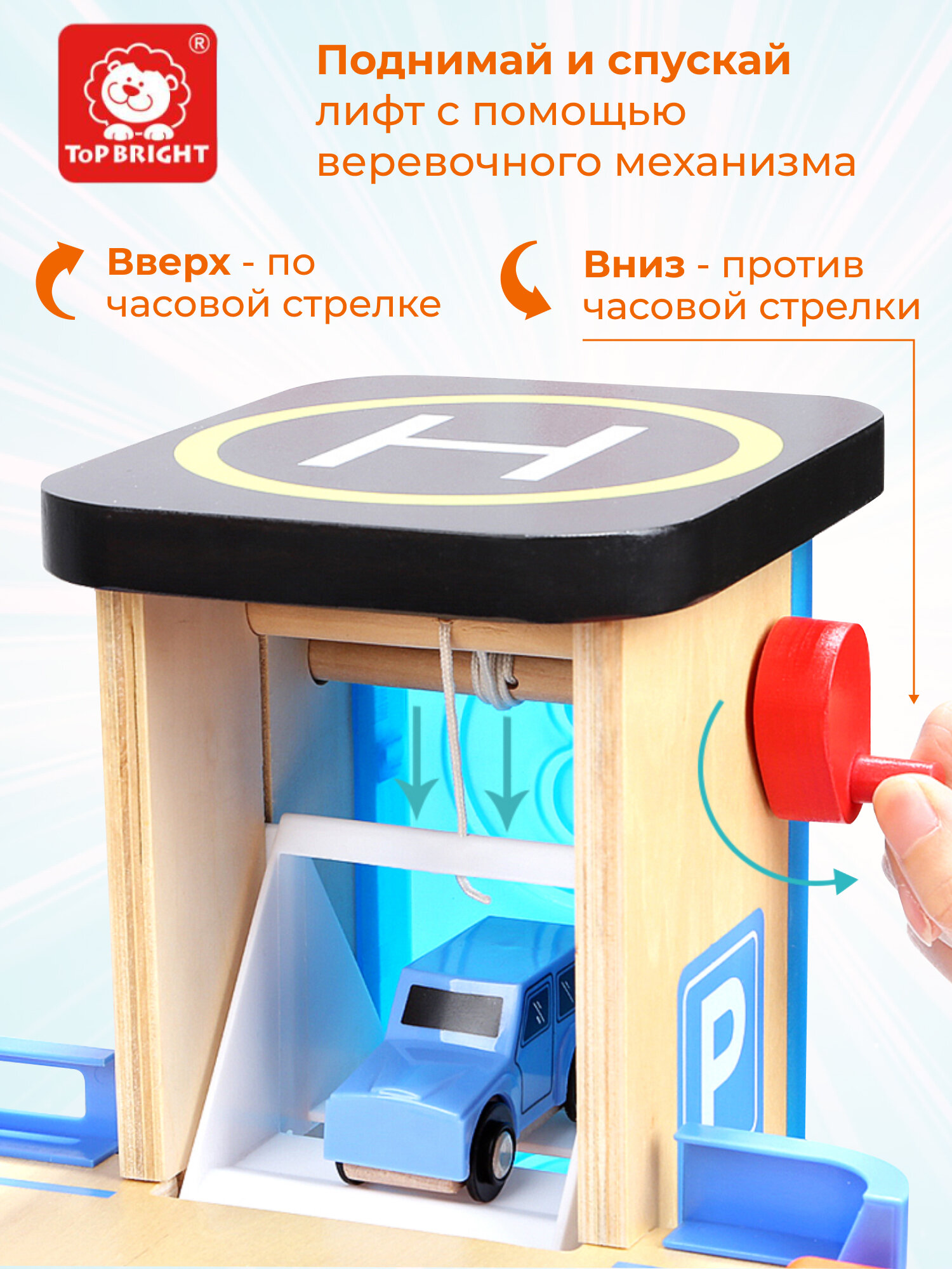 Деревянная парковка TOPBRIGHT 3 уровня гараж лифт вертолет 150154 Игровой набор Парковка с лифтом 3 уровня